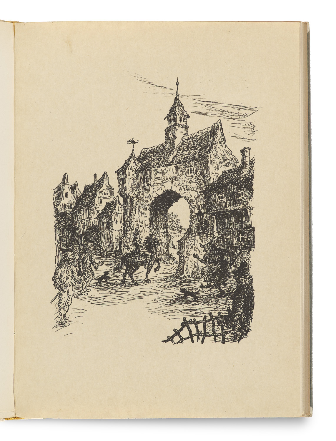 Die Elixiere des Teufels. Nachgelassene Papiere des Bruders Medardus eines Kapuziners. Mit 8 (1. monogrammiert) Originalsteinzeichnungen von Rolf von Hoerschelmann. Weimar, Lichtenstein, 1923. 187 S., 1 Bl. 4°. Handgebd. Orig.-Halbschweinsleder mit goldgepr. Deckelvignette (schwach lichtrandig).