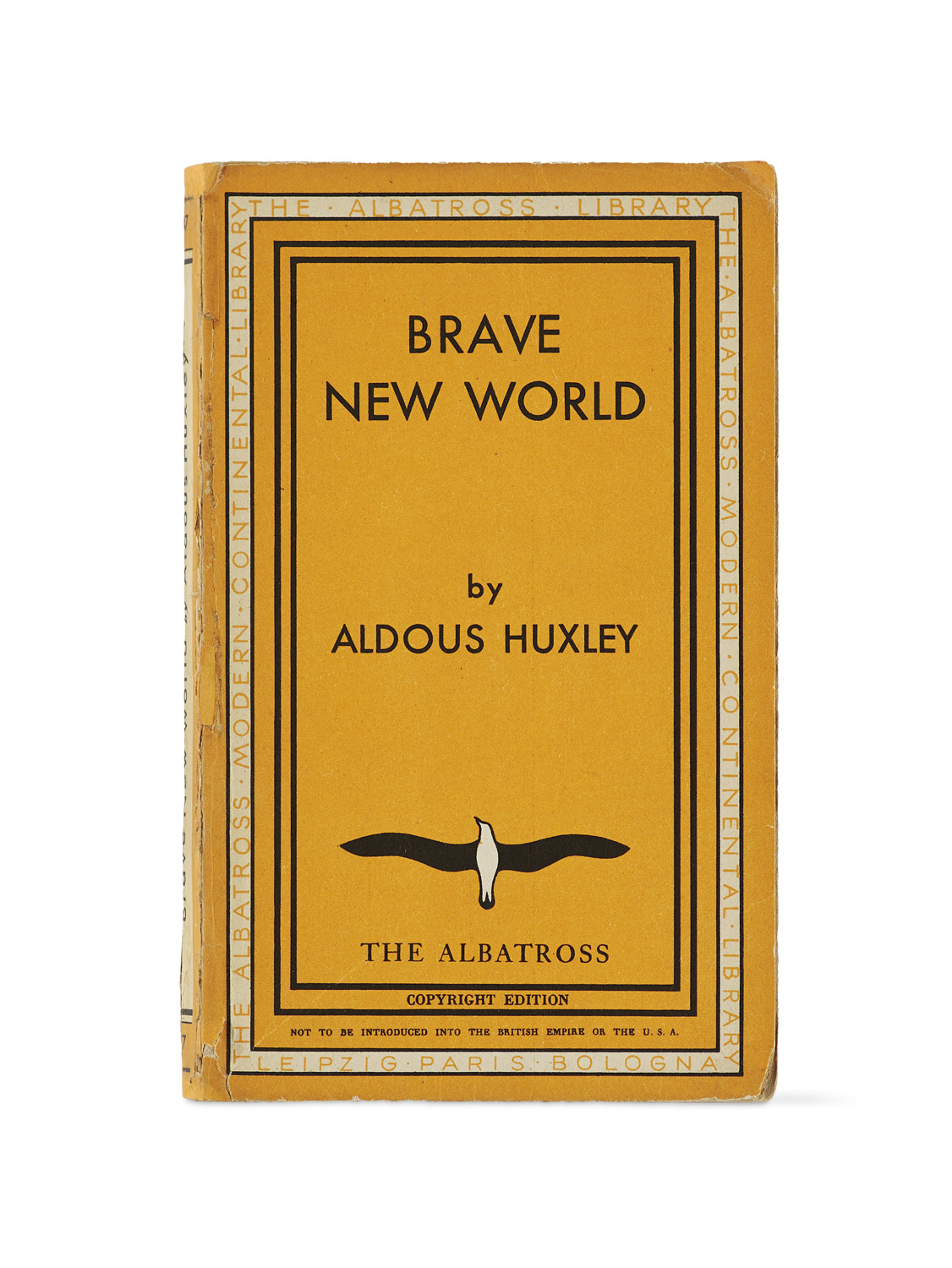 Brave New World. Leipzig-Paris-Bologna, Albatross, 1938. 257 S., 3 Bll. Kl.8°. OBroschur mit OUmschlag (berieben und bestoßen, Gelenk angebrochen, Rücken des Umschlags restauriert).