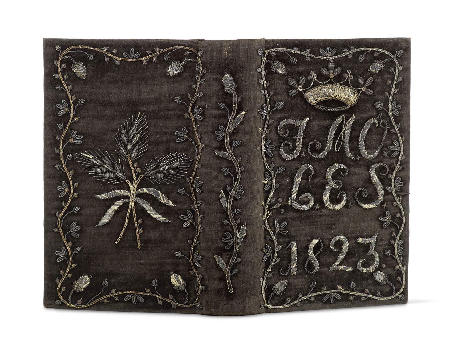 Theologie und Religionswissenschaften – Evangelisches Gesangbuch des späten 18. Jahrhundrts in reich dekoriertem Samteinband. Vorderer Deckel bestickt mit den Initialen "J.M.C. L.E.S." und datiert in das Jahr 1823. Zweifarbig gestickte Ranken mit Eicheln verzieren den Rand des vorderen und hinteren Deckels. Auf dem hinteren Deckel zentral drei zusammengebundene Ehren. Den Rücken ziert eine weitere Ranke mit einer Eichel. - Sehr sauberes Exemplar mit einem prachtvollen Einband.
