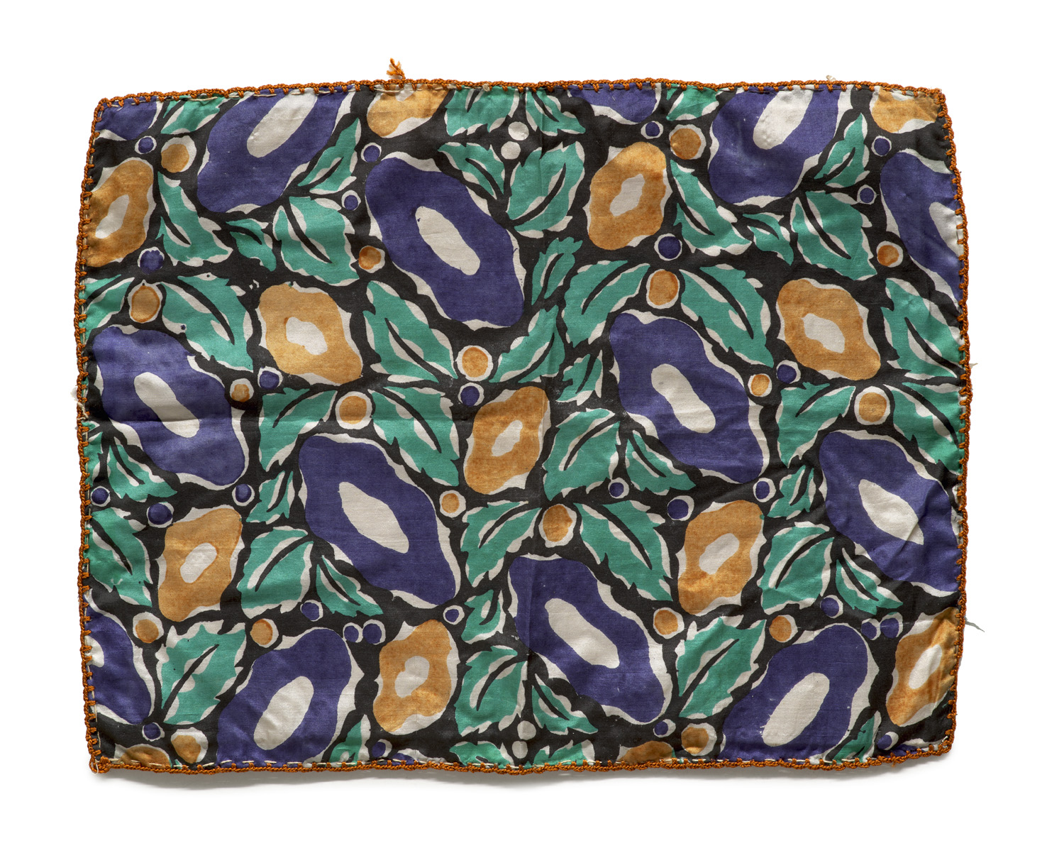 Blumenwiese. Um 1910. Stoffmuster aus bedruckter Seide, mit geknüpfter Bordüre. 37,5 x 28,5 cm. Unter Glas gerahmt.