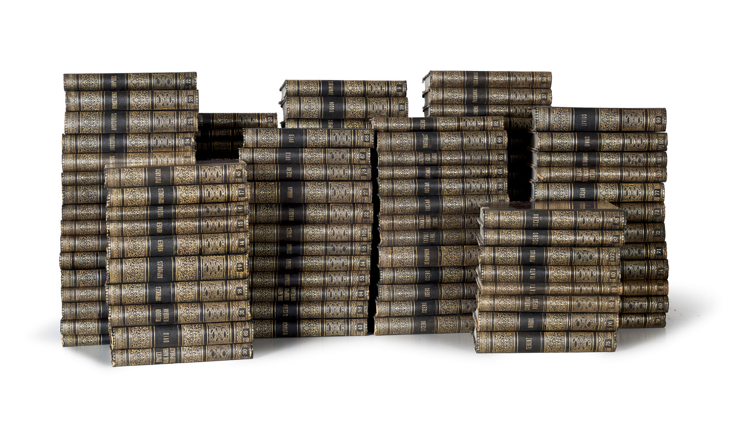 Langenscheidtsche Bibliothek sämtlicher griechischen und römischen Klassiker in neueren deutschen Musterübersetzungen. Komplette Reihe in 110 Bänden. Berlin, Langenscheidt, 1855-1917. Kl.-8°. OHLdrbde. (versch. Auflagen). Mit reicher RVerg. und RTitel (teils leicht bestoßen).