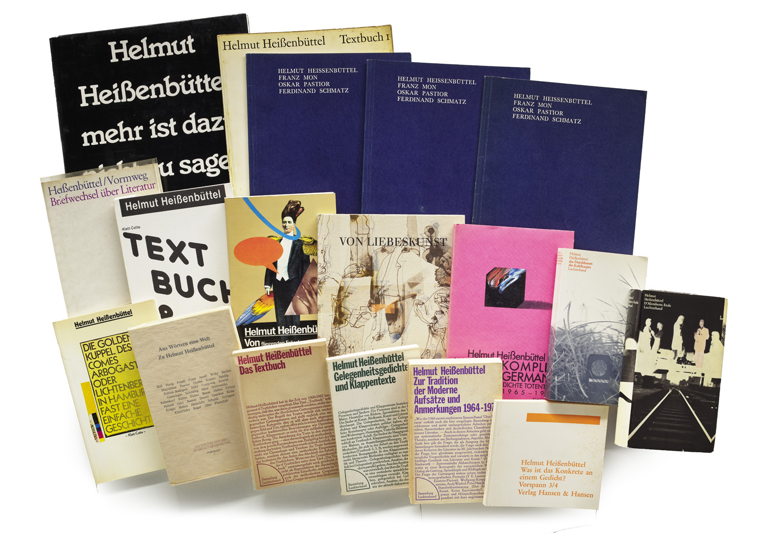Moderne Literatur und Kunst – Umfangreiche Sammlung mit Gedichten und Essays von und Werken über Helmut Heissenbüttel (1921-1996), einem maßgeblichen Protagonisten der deutschen Konkreten Poesie in der zweiten Hälfte des 20. Jahrhunderts. - Enthält: 1. Textbuch 1. Olten und Freiburg im Breisgau, Walter-Verlag, 1960. 40 (2) S. 4°. OBr., Umschl. mit Klarsichtfolie bezogen. - Wilpert/Gühring 4. - Mit eh. Widmung des Autors auf dem Titelblatt. - Umschlag berieben und gering fleckig, an den Rändern papierbedingt gebräunt. - 2. Was ist das Konkrete an einem Gedicht. Zwei Ansätze. (= Vorspann 3/4) Itzehoe, Hansen & Hansen, 1969. 120 S. Lex.-12° OBr. - Wilpert/Gühring 19. - Umschlag etwas stockfleckig, papierbedingt etwas gebräunt. - 3. Briefwechsel (mit Heinrich Vormweg) über Literatur. Neuwied und Berlin, Luchterhand, 1969. 97 (3) S. 8° Orig. engl. Br., in Klarsichtfolie. - Wilpert/Gühring 18. - Papierbedingt etwas gebräunt. - 4. Projekt Nr. 1. D'Alemberts Ende. Neuwied und Berlin, Luchterhand, 1970. 390 (2) S. 8°. OLn. im illustr. OUmschl. - Wilpert/Gühring 24. - Mit eh. Signatur des Autors auf dem Titelblatt.- Umschlag mit Lichtrand, Schnitt minimal schmutzfleckig. - 5. Das Textbuch. (Sammlung Luchterhand, 3). Neuwied und Berlin, Luchterhand, 1970. 3282 (2) S. Kl.-8°. OBr in Klasichtfolie. - Umschlag und Ränder papierbedingt etwas gebräunt. - 6. Zur Tradition der Moderne. Aufsätze und Anmerkungen 1964-1971. (Sammlung Luchterhand, 51). Neuwied und Berlin, Luchterhand, 1972. 394 (6) S. Kl.-8°. OBr. - Wilpert/Gühring 29. - Rücken gebräunt, Umschlag mit Lichtrand, Schnitt gering stock- und schmutzfleckig. - 7. Gelegenheitsgedichte und Klappentexte. (Sammlung Luchterhand, 66). Darmstadt und Neuwied, Luchterhand, 1973. 142 (2) S. Kl.-8°. OBr. in Klarsichtfloie (mit Preisetikett). - Wilpert/Gühring 34. - Mit eh. Widmung des Autors auf dem Titelblatt. - Sehr gut erhalten. - 8. Das Durchhauen des Kohlhaupts. 13 Lehrgedichte. Projekt Nr. 2. Darmstadt und Neuwied, Luchterhand, 1974. 233 (5) S. Kl.-8°. Illustr. orig. engl. Br. - Wilpert/Gühring 36. - Mit eh. Signatur des Autors auf dem Titelblatt.- Schnitt etwas staubig. - 9. Die goldene Kuppel des Comes Arbogast oder Lichtenberg in Hamburg. Mit 10, wovon 8 doppels. farb. Illustr. Stuttgart, Klett/Cotta, 1980. 104 (4) S. 8°. Illustr. Orig. engl. Br. - Wilpert/Gühring 45. - Umschlag mit Lichtrand. - 10. Ödipuskomplex made in Germany. Stuttgart, Klett/Cotta, 1981. 105 (3) S. 8°. Illustr. OPbd. im illustr. OUmschl. - Wilpert/Gühring 52. - Sehr sauberes Exemplar. - 11. Aus Wörtern eine Welt. Zu Helmut Heissenbüttel. Mit Beiträgen von 40 Autoren, u.a. von Heinrich Böll, Reinhard Döhl, Ernst Jandl, Friederike Mayröcker, Franz Mon, Gerhard Rühm und Ginka Steinwachs. Nicht nummeriertes Exemplar der Vorzugsausgabe von 100 Exemplaren mit 23 Signaturen von Beitragenden (u.a. die Genannten) auf dem Titelblatt. Frankfurt/Main, Qumran, 1981. 195 (5) S. Kl.-8°. Illustr. OPbd. in dünner Pergaminfolie. - Titelbl. mit Lichtrand, Schnitt gering fleckig. - 12. Von fliegenden Fröschen, libidinösen Epen, vaterländischen Romanen, Sprechblasen und Ohrwürmern. 13 Essays. Stuttgart, Klett/Cotta, 1982. 189 (3) S. 8°. Illustr. orig. engl. Br. - Wilpert/Gühring 43. - Kopfschnitt gering verschmutzt, insgesamt sehr sauber. - 13. mehr ist dazu nicht zu sagen. neue herbst. Mit 64 Illustr. von Heinz Edelmann. Stuttgart, Klett/Cotta, 1983. 136 S. Gr.-4°. Orig. franz. Br. - Wilpert/Gühring 56. - Eines von 1300 Exemplaren der Normalausgabe. - 14. (3 Ex.) neue texte, Nr. 30. (Helmut-Heissenbüttel-Heft). Mit Beiträgen von Helmut Heissenbüttel, Franz Mon, Oskar Pastior und Ferdinand Schmatz. Linz, Selbstvlg., 1984. 28 nn. S. 4°. Illustr. OBr. 15. Textbuch 8. 1981-1985 Stuttgart, Klett/Cotta, 1985. 93 (3) S. 8°. Orig. engl. Br. - Wilpert/Gühring 65. - Umschlag gering angeschmutzt. - Mit eh. Widmung des Autors auf dem Titelblatt. - 16. Von Liebeskunst. Ein Poem. Buchgestaltung von Armin Sandig unter Verwendung von 25 reproduzierten farbigen Kaltnadelradierungen. Eines von 1.500, vom Illustr. signierten Exemplaren als Jahresgabe der Maximilian-Gesellschaft. Hamburg, Vlg. d. Max.-Ges., 1985. 54 (8) S. Lex.-8°. Illustr. OPbd. im OSch. - Wilpert/Gühring 64. - Sehr sauberes, unaufgeschnittenes Exemplar.