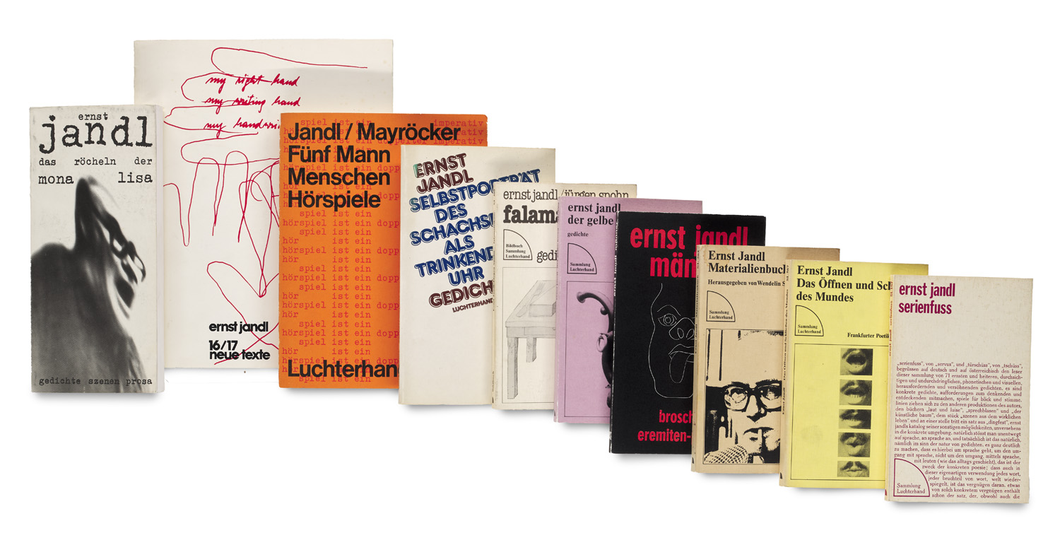 Modern Literature and Art – Collection of 10 volumes, 5 of which first editions and further 3 inscribed by the author. - A superb early collection of poems, scenes and prose by Austrian poet and performing artist Ernst Jandl (1925-2000), one of the most prolific and renown contributors to German-language concrete and visual poetry in the second half of the 20th century, who also became notoriously famous for his perfomative poetry recitals. - For details see the German entry above.