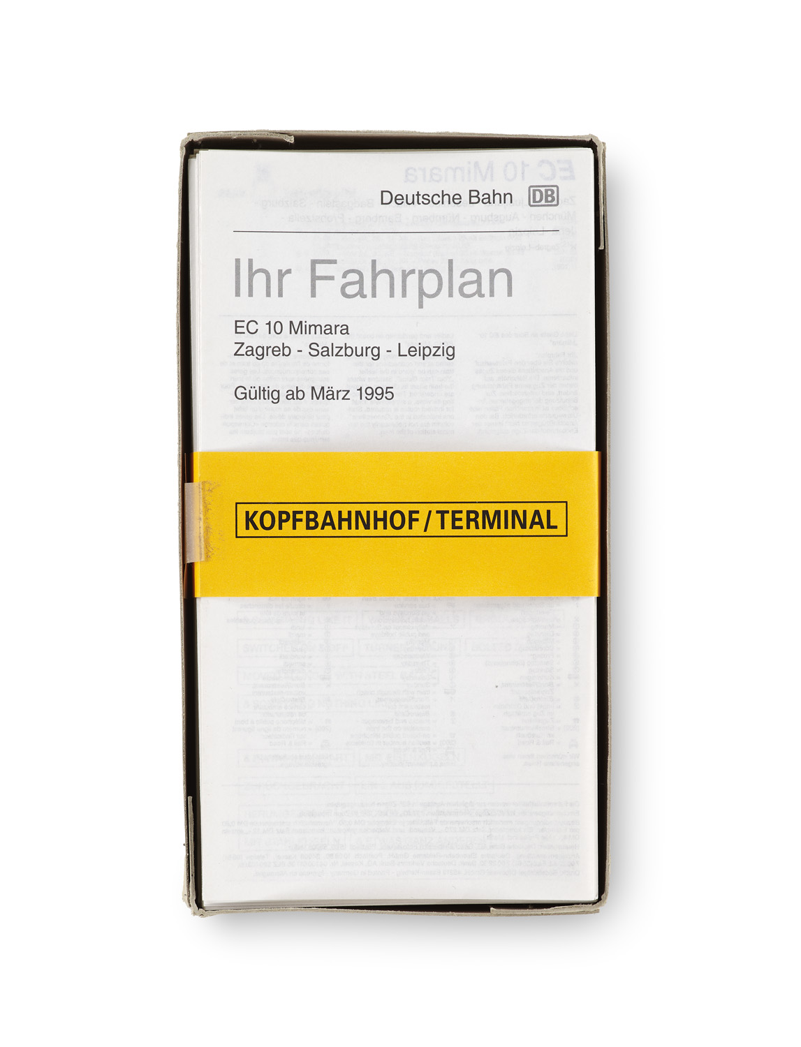 Kopfbahnhof/Terminal. Multiple mit gefalteten, farbig gedruckten Fahrplänen. Leipzig, Galerie für Zeitgenössische Kunst, 1995. Gedruckt in Schwarz und Blau oder Schwarz und Rot auf weißem oder cremefarbenem Papier. 22,5 x 12 cm. Die Fahrpläne lose in gelber, typogr. betitelter Bauchbinde (rückseitig vom Künstler monogrammiert und nummeriert) in Orig. Pp. Schachtel mit DTitel. Im Innendeckel mit mont. Schildchen, hier mit Angaben zur Edition (minimal gebrauchsspurig, etwas angebräunt).