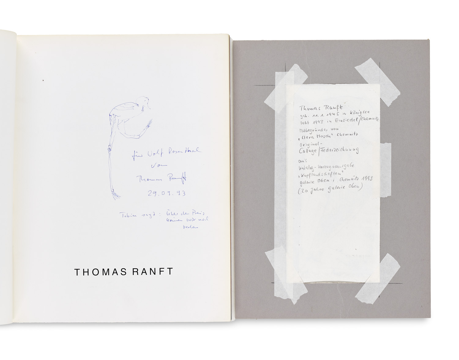 Moderne Literatur und Kunst – Unikales Exemplar aus dem Besitz von Wolf Rosenthal mit zusätzlicher Einbandzeichnung (dat. und gewidmet), Innendeckel signiert, beil. ganzseitiger Orig.-Zeichnung für Wof Rosenthal, beilieg. sign. Or.-Rad. u. sign. Siebdruck sowie eingebundener Brief mit Zeichnung von Wolf Rosenthal. - Dabei: Thomas Ranft, Die Erde eine vergessene Liebe. (Katalog). Chemnitz, Galerie Oben, 1993. 4°. OKart. - Mit eigenhändiger Zeichnung auf Vorsatz mit Widmung für Wolf Rosenthal. Beiliegt: Orig. Collage/Federzeichnung aus VA Kopflandschaften 1993. (unter Passepartout montiert).
