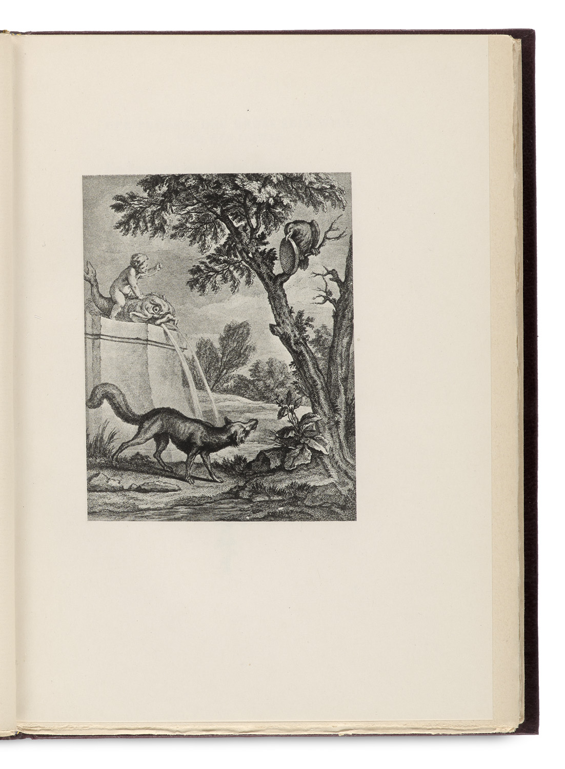 Fabeln. Ins Deutsche übertragen von Theodor Etzel. Mit 24 Tafeln in Kupfertiefdruck nach den Stichen von J.B. Oudry. Berlin, Propyläen, 1923. 217 S., 3 Bll. Gr.-8°. Einband von Hugo Steiner-Prag. Weinrotes Maroquin mit Kopfgoldschnitt, goldgepr. blauen RSchild, RVergold. u. goldgepr. DVignette in Pp.-Schuber mit RSchild (dieser lichtrandig).