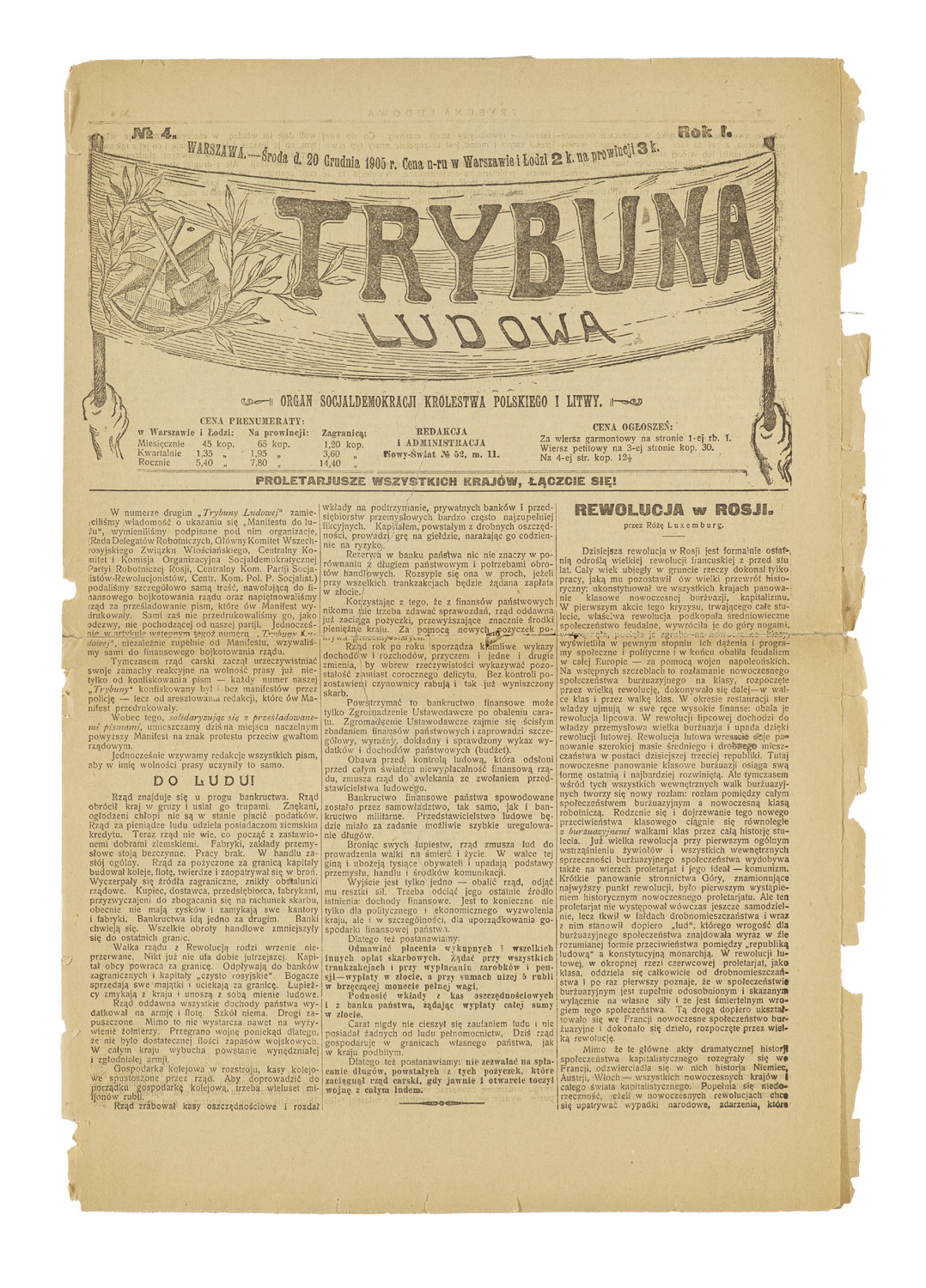 (The Revolution in Russia) Rewolucja w Rosji. (In: Trybuna Ludowa. Organ Socjaldemokracji Krolestwa Polskiego i Litwy. No. 4. Rok I. (December 20, 1905). Folio.