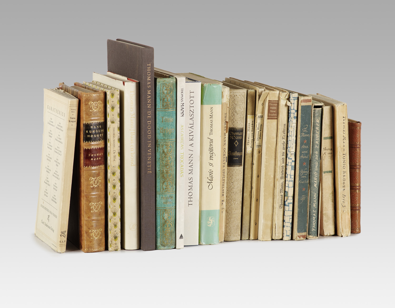 Moderne Literatur und Kunst – Enthält: Friedrich und die große Koalition. Berlin, Fischer, 1915. - Herr und Hund. Gesang vom Kindchen. Berlin, Fischer, 1919. - Tonio Kröger. Stockholm, Wahlström & Widstand, 1922. - Ockulta Upplevelser. Stockholm, Wahlstrom & Widstrand, 1924. - Bemühungen. Berlin, Fischer, 1925. - Unordnung und frühes Leid. Berlin, Fischer, 1926. - Gesang vom Kindchen. Berlin, Fischer, 1928. - Sieben Aufsätze. Berlin, Fischer, 1929. - Mario und der Zauberer. Berlin, Fischer, 1930. - Hans Kunglig Höghet. Stockholm, Vart Hems, 1930. - Tonio Kröger. Den Haag, Nederlandsche Boekenclub, 1934. - Tonio Kröger. Kopenhagen, Carit Andersens, 1946. - Neue Studien. Berlin u. Frankfurt a.M., Suhrkamp, 1948. - Meerfahrt mit Don Quijote. Berlin, Insel-Verlag, 1956. - De Wet. Delft, W. Gaade N.V., 1956. - A Törvény. Budapest, Magyar Helikon, 1958. - Baas en hond. Amsterdam, Uitgeverij De Arbeiderspers, 1974. - De dood in Venetië. Utrecht, De Roos 1977. - A kiválasztott. Budapest, Magyar Helikon, 1980. - As cabeças trocadas. Rio de Janeiro, Editora Nova Fronteira, 1987. - Mario si vrajitorul. Bukarest, Editura Univers, 1994. - Nicht eingehend kollationiert. - Vorsätze tls. erneuert, papierbedingt etw. gebräunt, nur vereinzelt mit hs. Eintragungen. Insgesamt wohlerhalten.