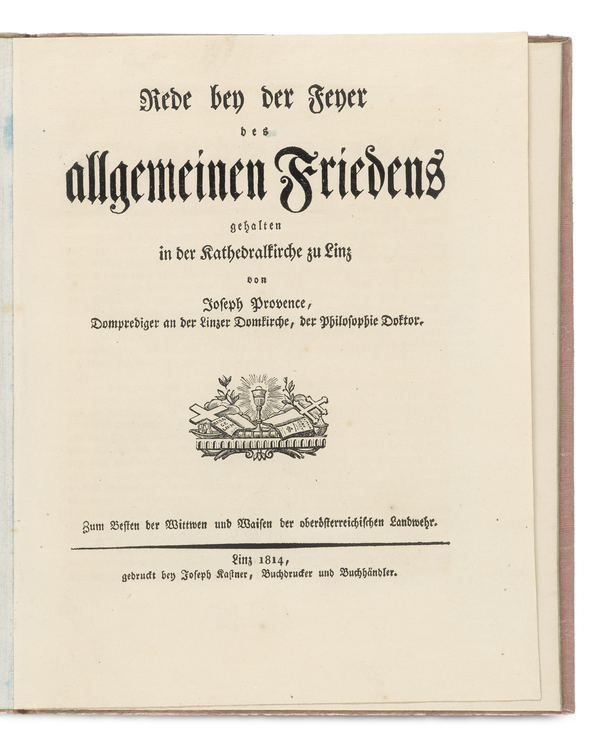 Theologie und Religionswissenschaften – Erste und einzige Ausgabe, aus der Bibliothek des österr. Kaisers Franz I. - Rede des Linzer Dompredigers anlässlich des Pariser Friedensabkommens zwischen Frankreich und der Koalition unter Beteiligung Österreichs nach dem Sturz Napoleons. - Provenienz: Franz I., Kaiser von Österreich zwischen 1804 und 1835, mit dessen Besitzerstempel auf dem Titelblatt recto, darüber der Stempel "FID.C" (Fideikomiss). Die Österr. Nationalbibliothek besitzt in ihrer Fideikommiss-Slg. bereits ein Exemplar. - Wohlerhaltes Exemplar dieses außergewöhnlichen Rarissimums von von höchster adeliger Provenienz.