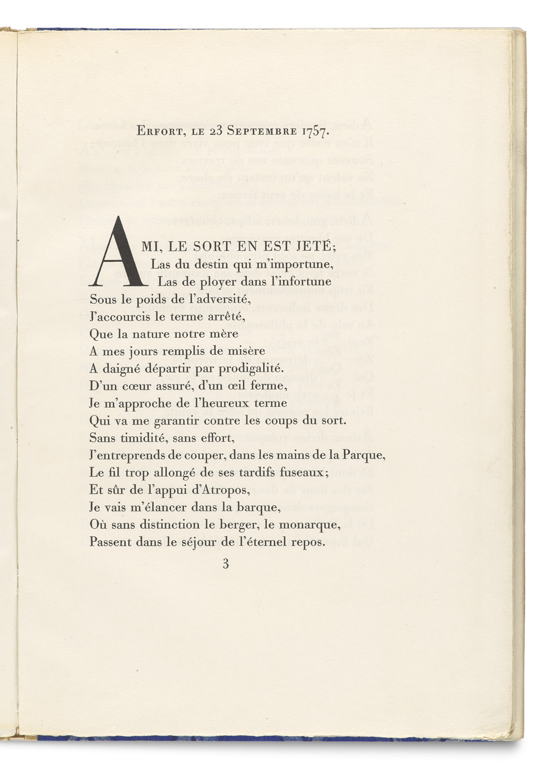 Moderne Literatur und Kunst – Zehnter Druck der Officina Bodoni, die Hans Mardersteig 1923 in Montagnola gegründet hatte. - Eins von 225 Exemplaren. - Mardersteig/Schmoller 10 - Gesetzt aus der Bodoni Catania Antiqua und Kursiv. - Breitrandiger Druck auf Bütten. - Mit dem französischen Originaltext des bedeutenden Briefgedichts, das der preußische König angesichts seiner ersten Niederlage im Siebenjährigen Krieg und der Nachricht vom Tod seiner geliebten Mutter an seinen Seelenfreund d'Argens verfasste. - Gut erhalten. - Dabei: Platon, Phaidon. Hbg., Hamburger Presse, 1920. Gr.-8°. OHPgt. 500 Expl. - Der Ackermann und der Tod. Mit farb. Initialen. Berlin, Union, 1955. 4°. OPGt. - Hölderlin, Brot und Wein. Darmstadt, Lehrdruckerei Techn. Hochschule, 1977. Quer-4°. OLdr. 15 Expl.