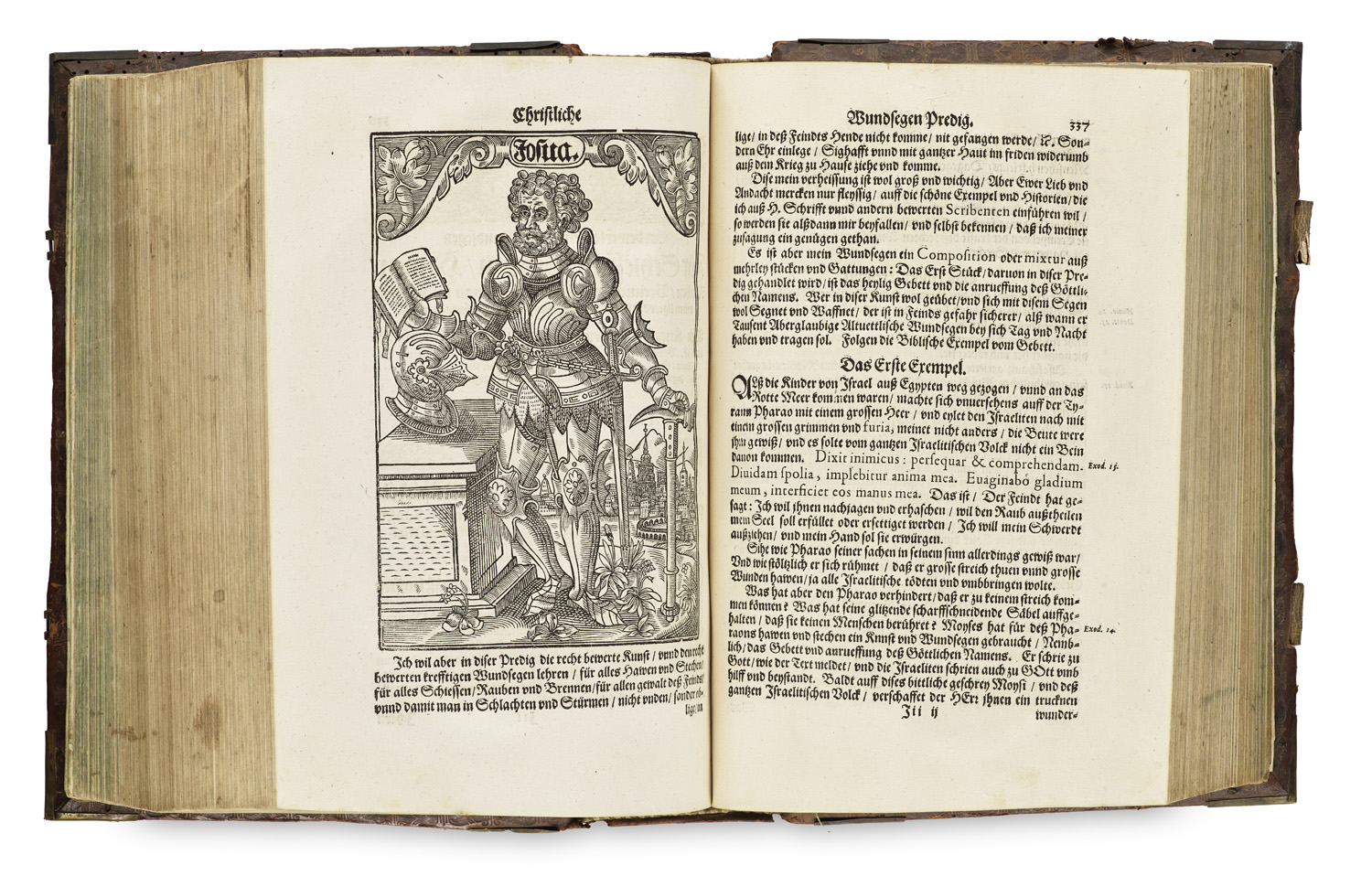 Theology and Religious Studies – 2 vols. Each with an illustrated title page and further woodcuts in the text. Leather over wooden boards with mounted spine label, metal corner fittings, gold-stamped ornaments and inner edges, and metal clasps (rubbed, worm-eaten, one clasp missing from the first volume). - Very rare. - First complete edition of the works of the Tyrolean Jesuit, court preacher, and theologian Georg Scherer. - With handwritten ownership notes on the flyleaf and title page. - Georg Scherer was a strong critic of Protestantism and criticized it in his sermons. While he found popular approval, this prevented him from fulfilling his duties as rector of the Jesuit college in Vienna, from which he was released in 1594. Scherer's sermons and writings are characterized by popular language and imagery. The front and back pages are heavily worm-eaten, with minimal foxing and some minimal water stains. The endpaper of the second volume has been torn out. Overall, very clean and well-preserved copies.