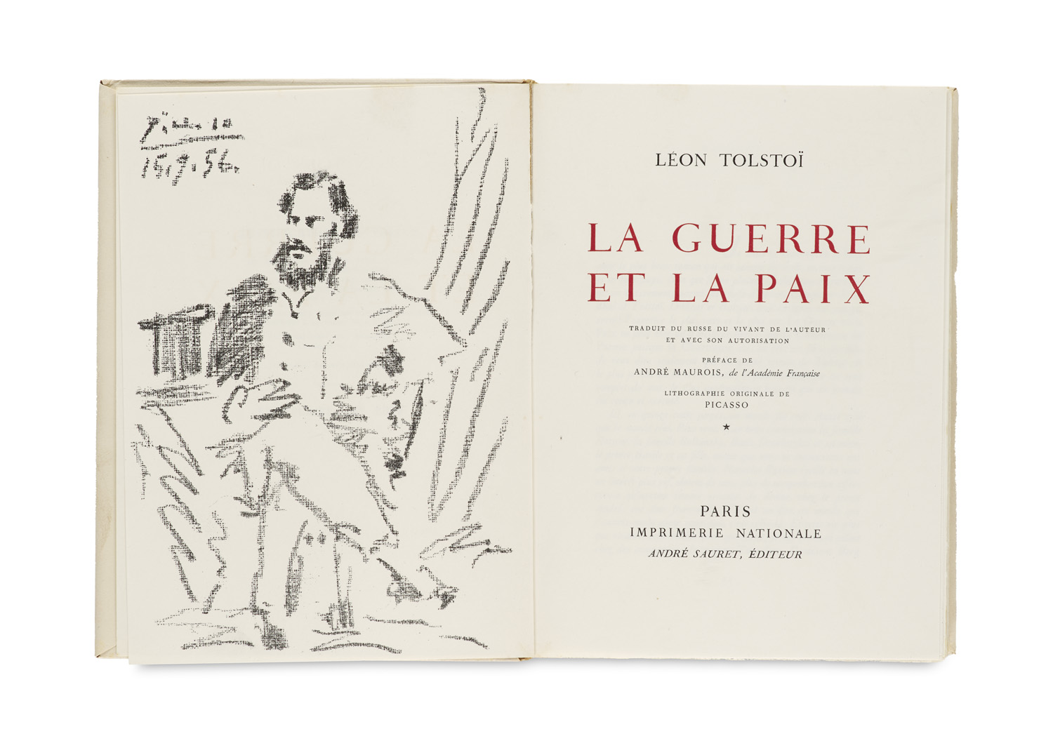 La Guerre et la Paix. 3 Bde. Mit einer Original-Lithographie von Picasso. Paris, Sauret, 1956. 8°. OBroschur je in OPp.-Schuber (etwas gebräunt und fleckig).