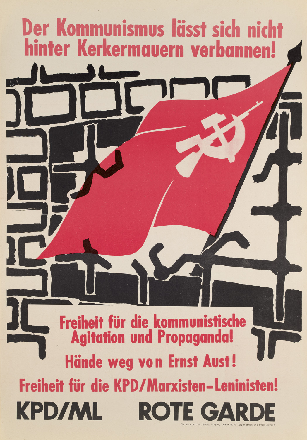 Modern Literature and Art – Communism - Collection of 13 illustr. posters (offset prints, lithographs a.o.) of the KPD/ML and Red Guard. 1970s. - Includes KPD posters "For an independent socialist Germany", "proletarian internationalism", against Ernst Aust, solidarity with the Spanish Communist Party (PCE (M-L)) and the struggle of the Cambodian people, demonstration for the 30th anniversary of Ernst Thälmann's assassination in Hamburg, 'Roter Morgen' central organ of the KPD/Marxist-Leninists. - 1 duplicate. - Some browning due to paper, occasional creases or folds, overall in good condition.