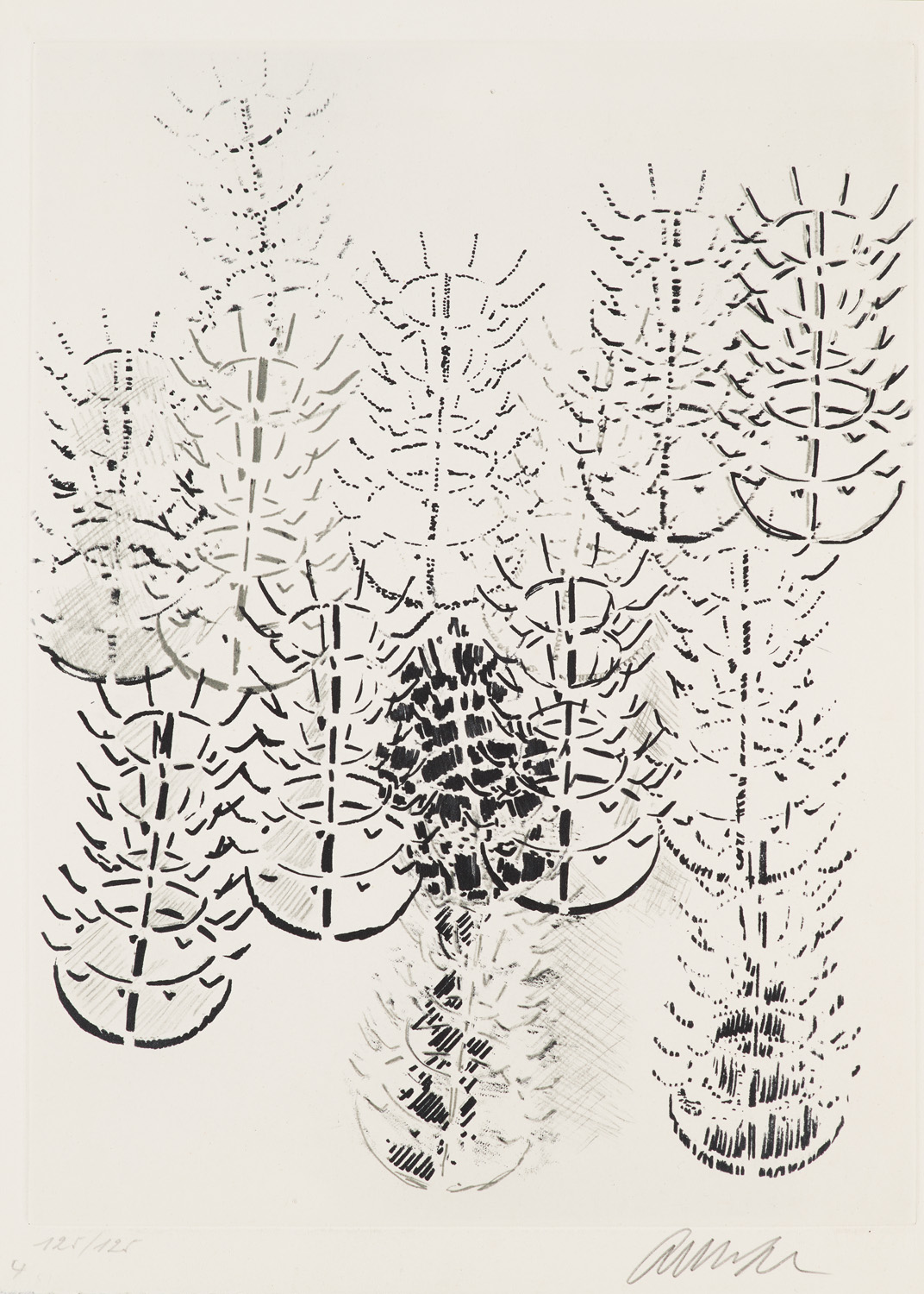 Hommage à Marcel Duchamp. 1971. Vernis mou auf Lana pur fil-Velin (mit Wz.). 34 x 25,8 cm (37,6 x 27,5 cm). Signiert und nummeriert. - Verso in den Ecken mit Spuren vorherigher Montierung. Insgesamt sehr gut. Ausgezeichneter, malerisch wirkender Druck mit leicht eingeprägter Plattenkante und schmalem Rand, rechts mit dem Schöpfrand.