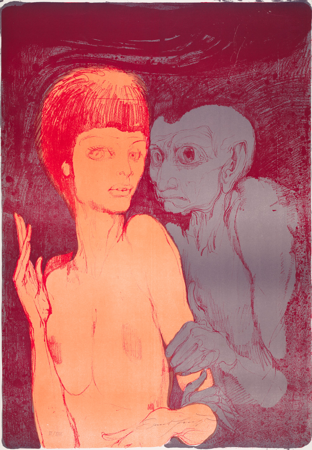 Das ungleiche Paar. 1967. Farblithographie auf festem Velin. 92,7 x 65 cm. Signiert und nummeriert. - Die Ecken leicht bestoßen sowie in den Kanten punktuell mit leichter Bereibung. Insgesamt sehr gut. Prachtvoller, kreidiger sowie farbintensiver Druck des großformatigen Blattes.