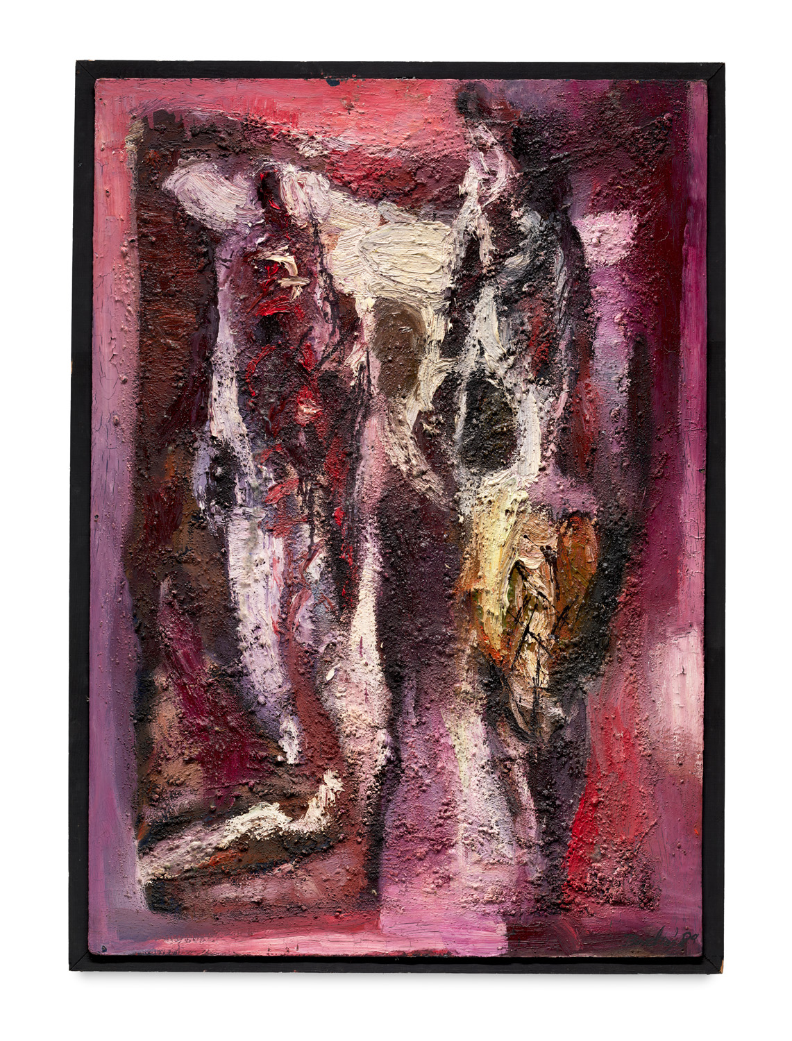 Zwei Figuren. Um 1980. Öl auf Platte. 100 x 70 cm. Signiert und datiert. Auf Künstlerleiste montiert. - Mit leichter Oberflächenanstaubung, partiell technikbedingt mit feinem Krakelee. Insgesamt sehr gut. Ausgesprochen expressive Arbeit in kräftigem Farbauftrag.
