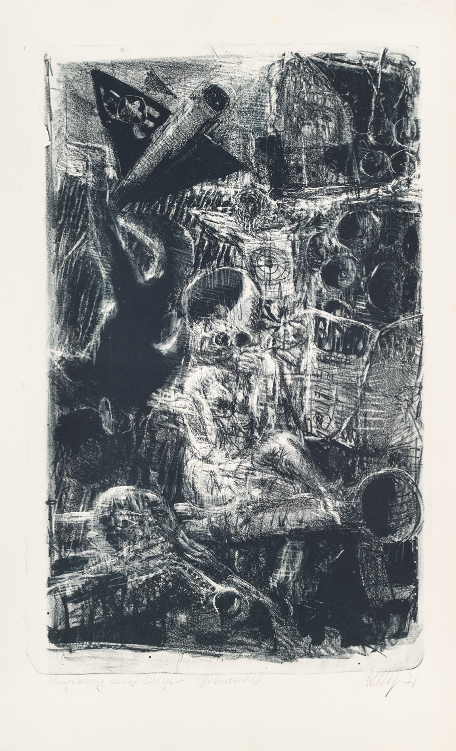 Umgebung eines Schlagers. 1971. Lithographie auf leichtem Velinkarton. 63,6 x 41 cm (76,8 x 47 cm). Signiert, datiert, betitelt sowie bezeichnet "Probedruck". - Die Ecken leicht bestoßen, oben rechts etw. knickspurig, nur vereinzelt mit äußerst blassbraunen Fleckchen. Insgesamt sehr gut. Prachtvoller, kreidiger Druck mit Rand.