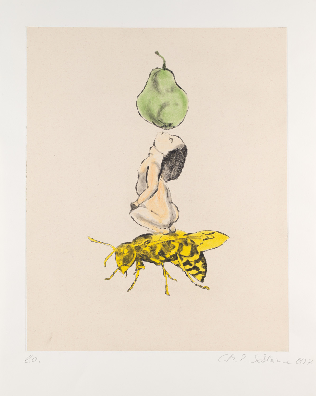 o.T. (Kniender Frauenakt mit Wespe und Birne). 2007. Radierung, aquarelliert, auf Bütten, ganzflächig auf festes Velin kaschiert. 37,1 x 21,4 cm (61,5 x 48,6 cm). Signiert, datiert und bezeichnet "e.a.". - Papier in zwei Rändern leicht gewellt, zwei blasse Fingerspuren, wohl technikbedingt, verso punktuell unfrisch, insgesamt sehr gut. Ausgezeichneter, mit der Aquarellierung herrlich changierender Druck mit Rand.