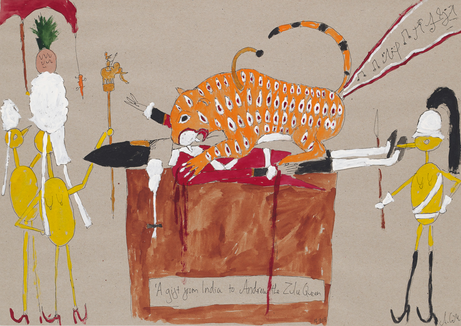 A gift from India to Andrew the Zulu Queen. 2008. Gouache und Feinliner auf grauem Velin. 30 x 42 cm. Signiert, datiert und betitelt. - Blatt technikbedingt leicht gewellt. Insgesamt sehr gut. Lebendige Komposition, die Farbe frisch und nuanciert.