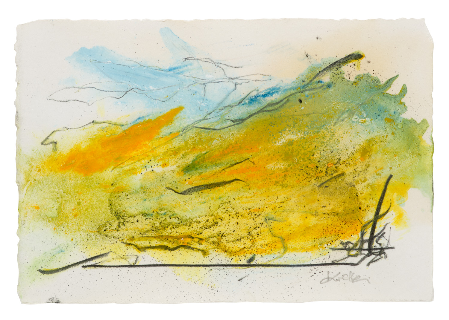 Ohne Titel (#1084). Um 1990. Aquarell und Mischtechnik auf Velin. 18 x 26 cm. Punktuell auf Unterlage montiert, in Passepartout freigestellt und hinter Glas gerahmt. - Ränder technikbedingt leicht unregelmäßig. Insgesamt sehr gut.
