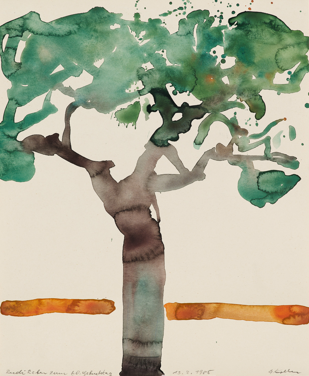 o.T. (Baum). 1985. Aquarell auf festem Velin. 29 x 23,8 cm. Signiert und datiert sowie mit Widmung des Künstlers. Punktuell auf Unterlage montiert, im Passepartout freigestellt. - Papierbedingt nur minimal und kaum merklich angebräunt. Insgesamt sehr gut, das Kolorit in frischer Erscheinung.