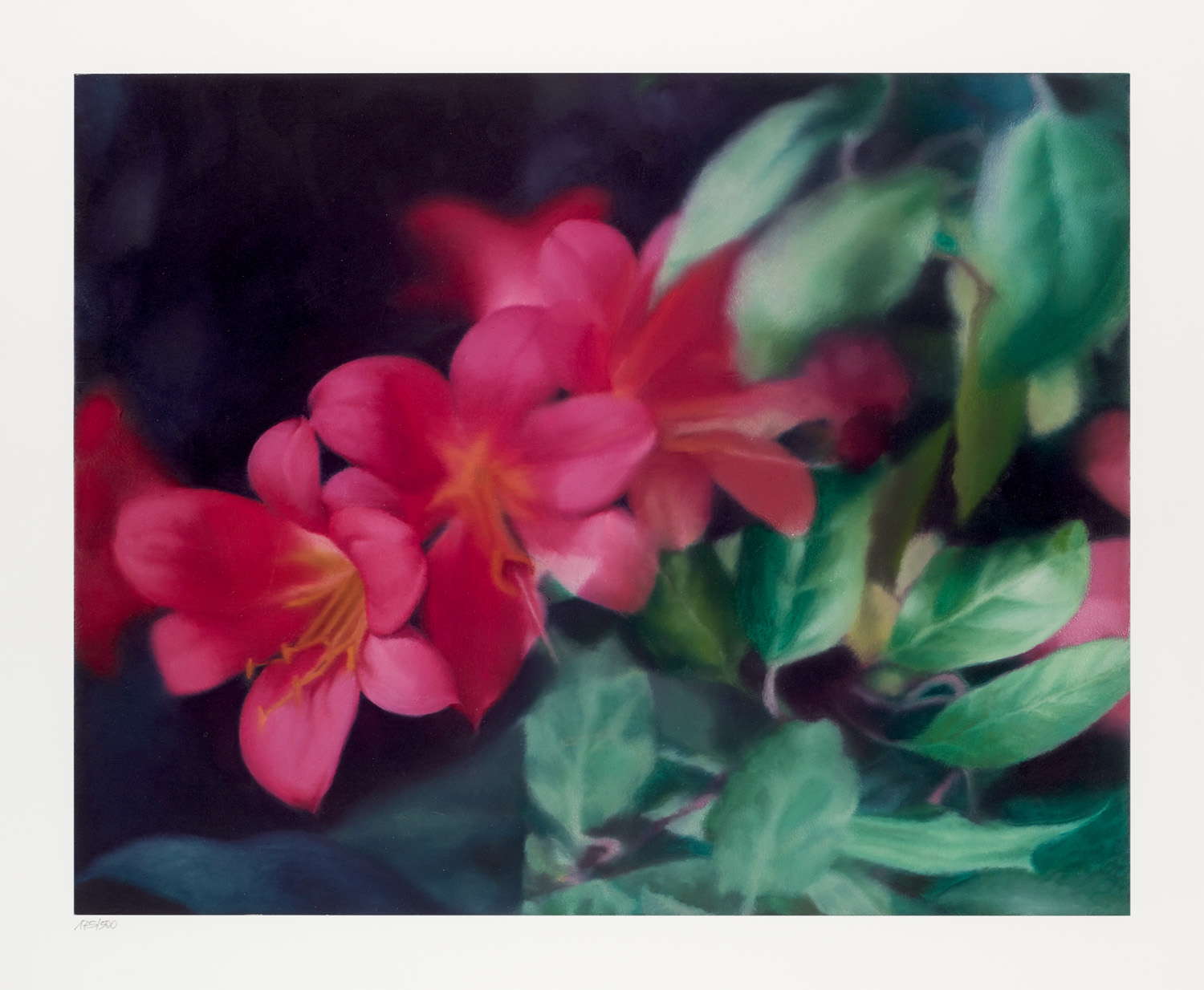 o.T. (Blumen). 2024. Pigmentdruck auf Velin. Sichtmaße 48 x 58 cm. Nummeriert. Im unteren Blattrand mit typogr. Angaben zu Motiv und Herausgeber. Unter Passepartout sowie Glas gerahmt (ungeöffnet). - Augenscheinlich sehr gut erhalten. Prachtvoller, farbintensiver Druck.