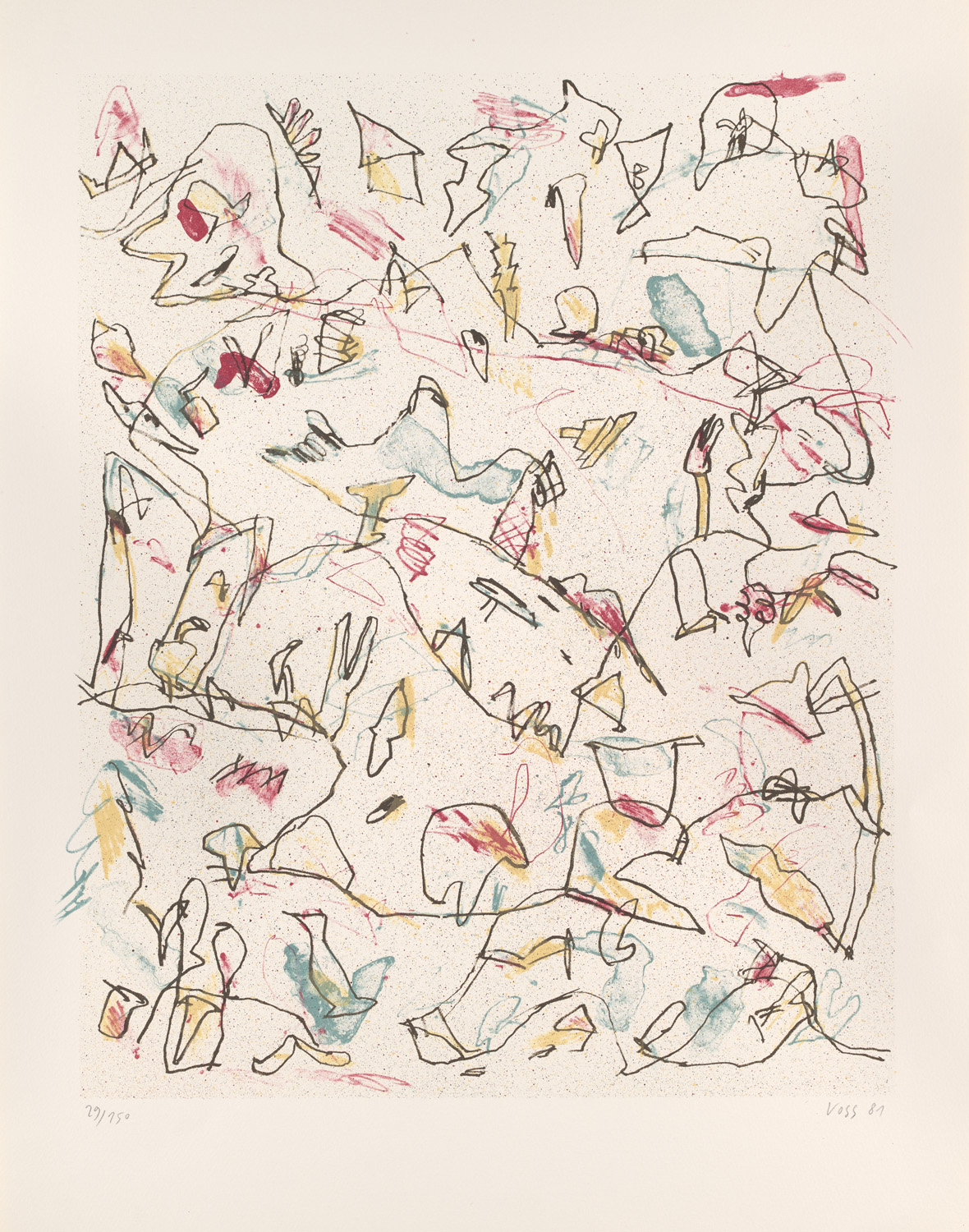 Online - Modern and Contemporary Art – Colour lithograph on wove paper. Signed, dated and numbered. - Minimally and barely noticeably browned at the edges. Otherwise very good. Splendid, beautifully chalky and nuanced impression of the fine-lined composition, the sheet with the scoop margin. - Jan Voss, an important contemporary artist, is known for his dynamic, often labyrinthine compositions that playfully combine lines, shapes and colours. His printmaking work reflects this characteristic visual language, utilising techniques such as etching, lithography and screen printing to create complex, multi-layered structures. Voss' works are characterised by an organic, almost narrative pictorial design. His works on paper are in close dialogue with his paintings and collages and expand his artistic universe with subtle nuances and new perspectives.