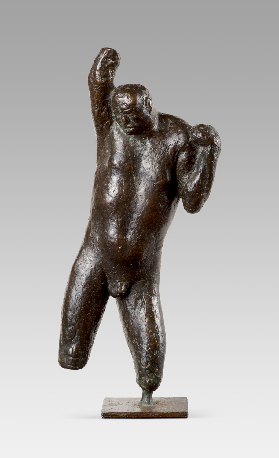 East German Art – Bronze with black-brown patina. Standing leg monogrammed on the back, at the bottom of the right leg inscribed 'II. I.'. - Slight dusting in the recesses, plinth only slightly oxidised in few spots. Overall very well preserved. Splendid cast with homogeneous patina and expressive surface modelling. - The sculpture, which is central to Fritz Cremer's oeuvre both iconographically and biographically, belongs to the series of figures entitled 30 Years of the October Revolution, created in 1967. The project included five bronze figures, each symbolising a decade of development between the October Revolution of 1917 and the anniversary year of 1967. This study, 'Aufsteigender II' (Ascending II), formed the basis for a monumental further development by Cremer. On the occasion of the simultaneous admission of the two German states to the United Nations, the GDR donated a cast of the monumental sculpture based on 'Aufsteigender II', which was installed in the park of the UN headquarters in New York City. Two further copies can be found today in front of the Kunsthalle Rostock and in Plauen in the Vogtland region.