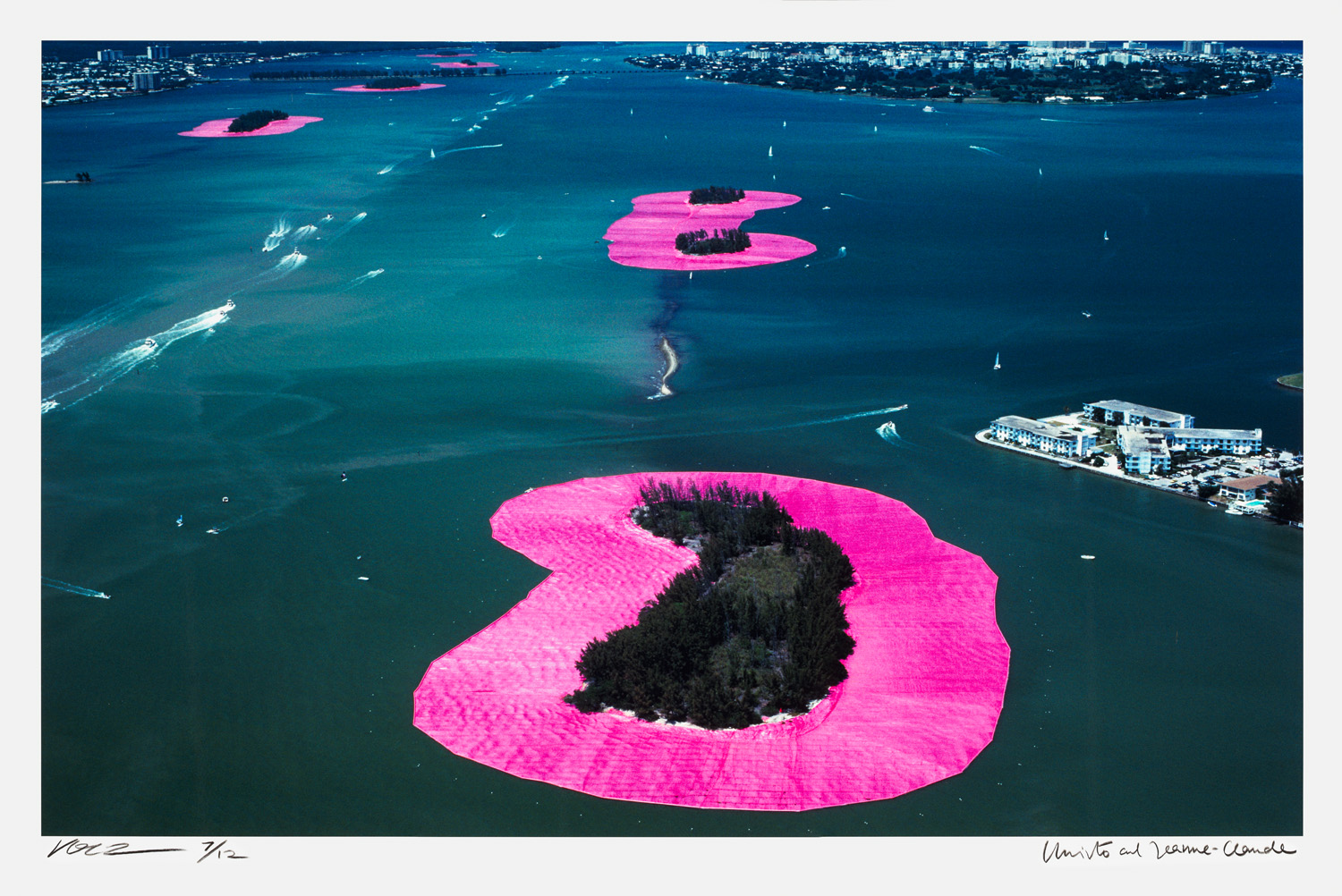 Nouveau Réalisme – Eines von 12 Exemplaren. - Entstanden in Zusammenarbeit mit und ebenfalls signiert von Wolfgang Volz. - Christo & Jeanne-Claude schufen mit Surrounded Islands ein ikonisches Werk der Land Art, das die Wechselwirkung von Kunst, Natur und Öffentlichkeit eindrucksvoll inszeniert. Die temporäre Installation in der Biscayne Bay bei Miami im Jahr 1983 gehört zu den bedeutendsten Großprojekten des Künstlerpaars. Die vorliegende Edition von 2006 zeigt eine zentrale Fotografie des Projekts, aufgenommen von Wolfgang Volz, dem langjährigen fotografischen Begleiter der Künstler. Der Pigmentdruck auf Dibond überzeugt durch außergewöhnliche Farbbrillanz, feine Detailzeichnung und hohe Beständigkeit.
