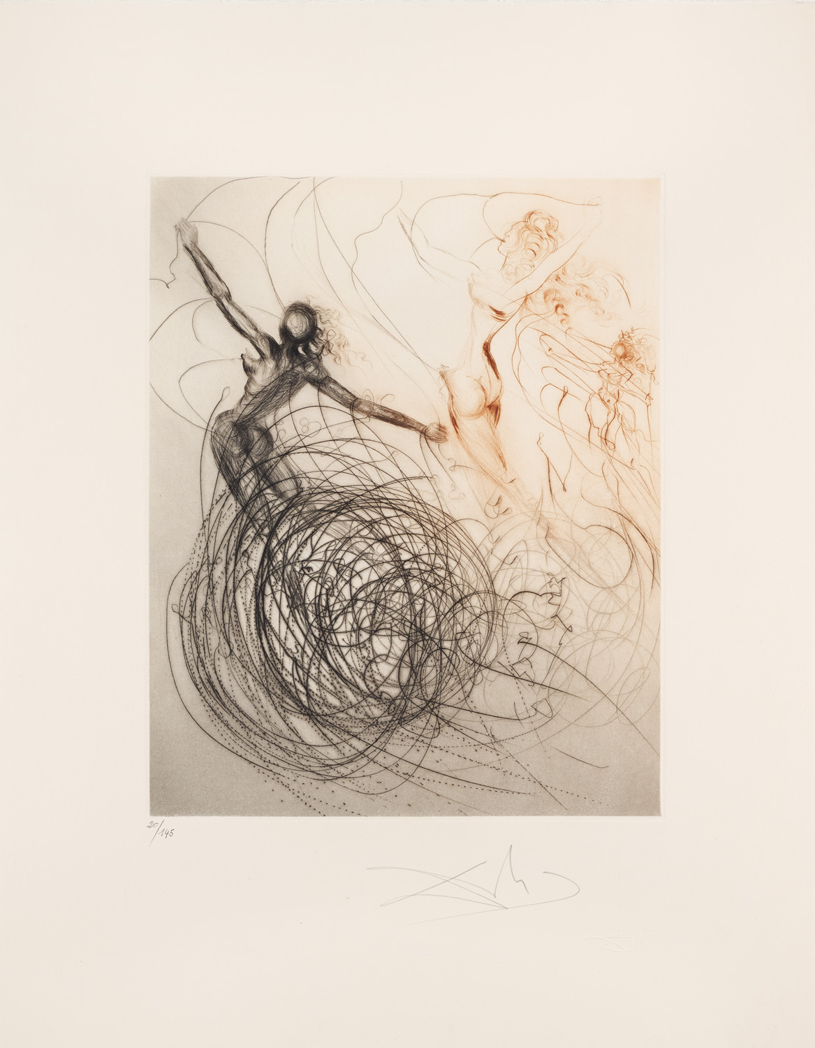 Surrealism – Colour drypoint on Arches wove paper (with watermark). Signed, numbered and with dry-stamp of the signature. Spot-mounted to mat. - Only isolated with light surface dusting in the margins. Overall very good. Splendid, burr-like impression with wide margin. - One of 145 copies.