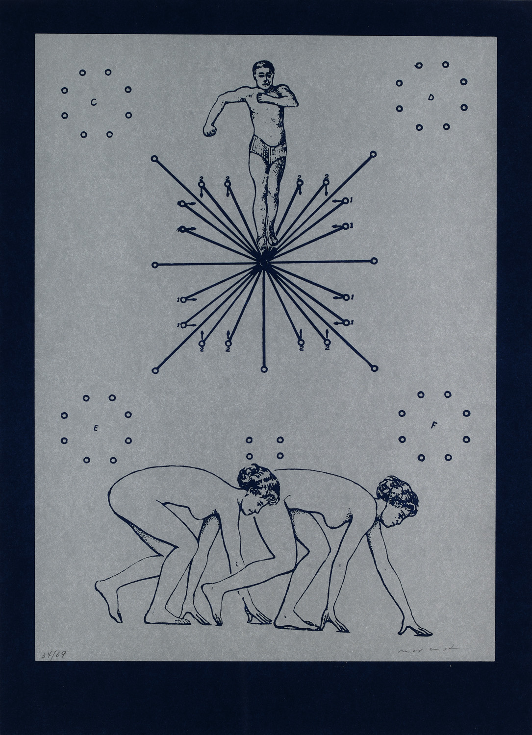 Endlose Spiele bereiten sich vor. 1972. Serigraphie in Silber auf dünnem blauen Velinkarton. 50 x 36,5 cm (58,6 x 42,7 cm). Signiert und nummeriert. In Punkten auf Unterlage montiert, unter Glas gerahmt. - Die Ecken minimal und kaum merklich bestoßen, nur absolut vereinzelt mit minimaler Oberflächenbereibung. Insgesamt sehr gut. Prachtvoller, satter Druck mit Rand.