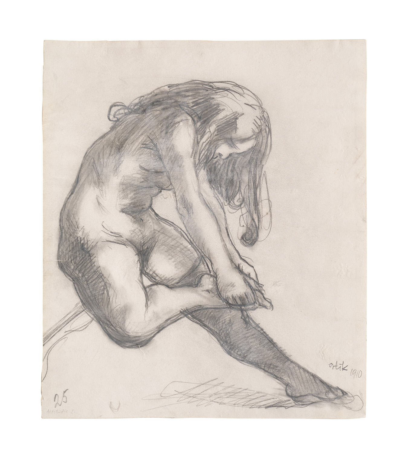 Aktstudie. 1910. Bleistift auf chamoisfarbenem Vélin voll aufgezogen auf Unterlage. 27,5 x 23,5 cm. Signiert und datiert sowie bezeichnet "25". - Blatt leicht unregelmäßig beschnitten. Technikbedingt mit kaum sichtbaren, kleinen Spannungsgfalten und Luftblasen durch Montierung auf Unterlage, insgesamt aber in gutem Zustand. Kräftig-dynamisch gezeichnete Aktstudie mit Schraffur.