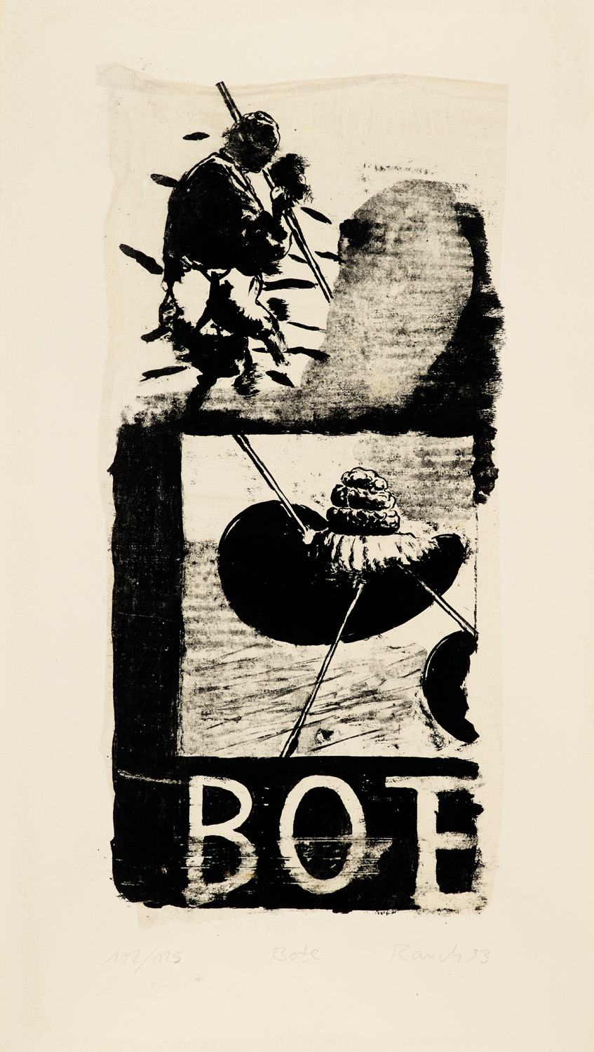 Zeitgenössische Kunst – Neo Rauch - Das grafische Werk, 1993 bis 2012, Ostfildern 2007, S. 53 - Eines von 125 Exemplaren. - Erschienen als Jahresgabe des Förderkreises der Leipziger Galerie für Zeitgenössische Kunst, Leipzig 1993 (verso mit dem Stempel). - Die Arbeit "Bote" zählt zu den frühen druckgrafischen Arbeiten Neo Rauchs und dokumentiert eine Übergangsphase seines Schaffens zwischen akademischer Ausbildung und der Entwicklung seiner charakteristischen malerischen Ausdrucksweise. In der Zeit unmittelbar nach der politischen und gesellschaftlichen Umbruchphase der deutschen Wiedervereinigung setzt sich Rauch mit Fragen von Kommunikation, Identität und Vermittlung auseinander. Die Figur des "Boten" verdichtet diese Themen symbolisch und fungiert zugleich als Mittler, Träger und Metapher für das Spannungsverhältnis zwischen individueller Erfahrung und kollektiver Geschichte.