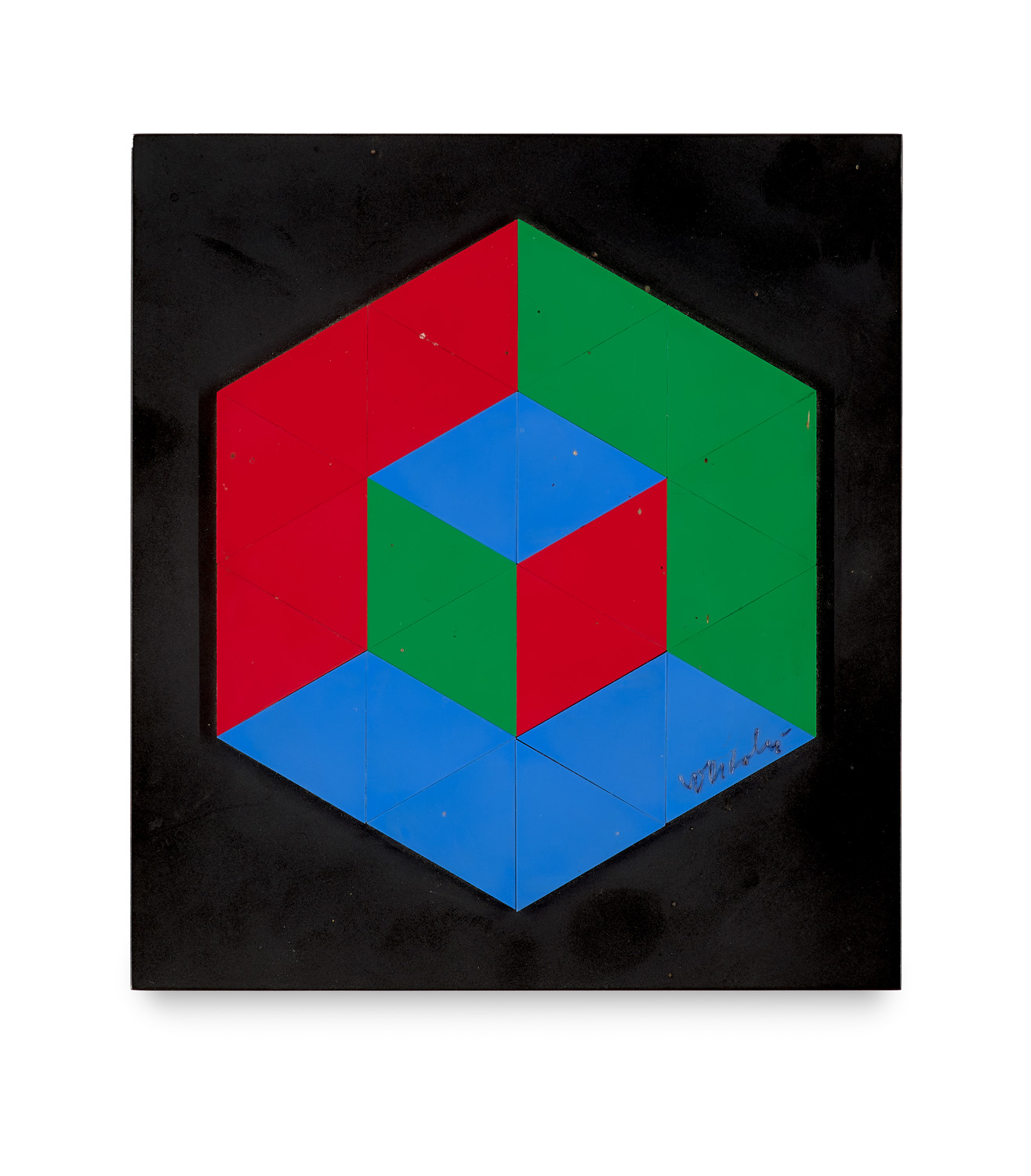 Geometrical Abstraction - Op Art – Plastic multiple on coated metal. Signed on the front, signed on a label on the back. - Some small abraisons on the surface and slightly dusty in places. Overall in good condition. Excellent, relief-like object. - One of 200 copies. Especially created by Vasarely for first exposition of his works in plastic materials at the Museum Ludwigshafen, March 15, 1972. Edition printed by Pyra AG, Switzerland.