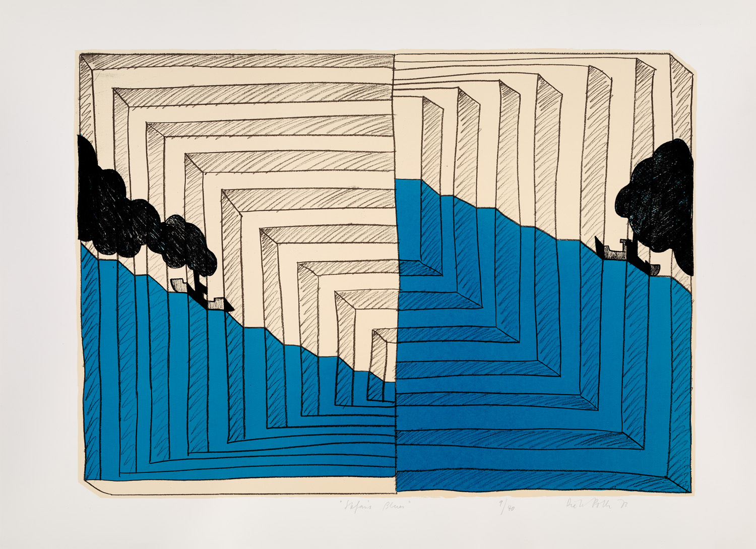 Stefan's Blues. 1973. Serigraphie in drei Farben auf BFK Rives Velin (mit Wz.). 61 x 84,5 cm (75,2 x 104,5 cm). Signiert, datiert, nummeriert und betitelt. - Nur in den Ecken mit minimaler und kaum merklicher Bestoßung. Insgesamt sehr gut. Prachtvoller und satter Druck der großformatigen Darstellung mit Rand.