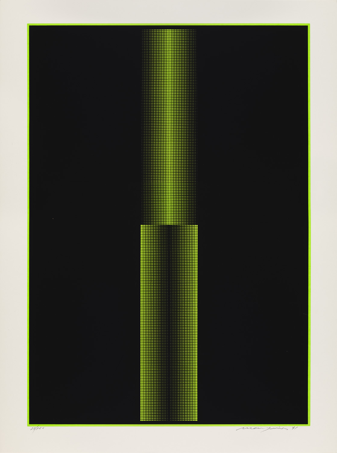 o.T. (Spiegel 70). 1971. Farbserigraphie auf leichtem Velinkarton. 73,7 x 51,8 cm (83 x 62 cm). Signiert, datiert und nummeriert. In typographisch serigraphiertem Orig.-Umschlag. - Leicht angestaubt, Ecken teils minimal bestoßen, wenige leichte Oberflächenbereibungen im Schwarz, v.a. unten links, dort wenige oberflächliche Kratzspuren, insgesamt gut. Prachtvoller, farbintensiver Druck mit breitem Rand.