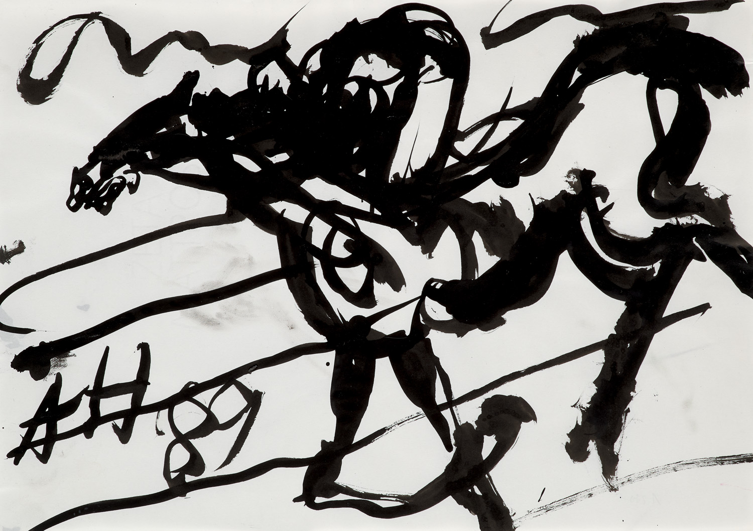 Turf. 1989. Tusche auf Zeta Papier (m.Wz.). 21 x 29,5 cm. Signiert und datiert. - Leicht gewellt aufgrund des Herrstellungsprozesses. Dezent knickspurig. Verso oben mit Resten früherer Montierung. Insgesamt gut. Hervorragende, dynamische Arbeit.