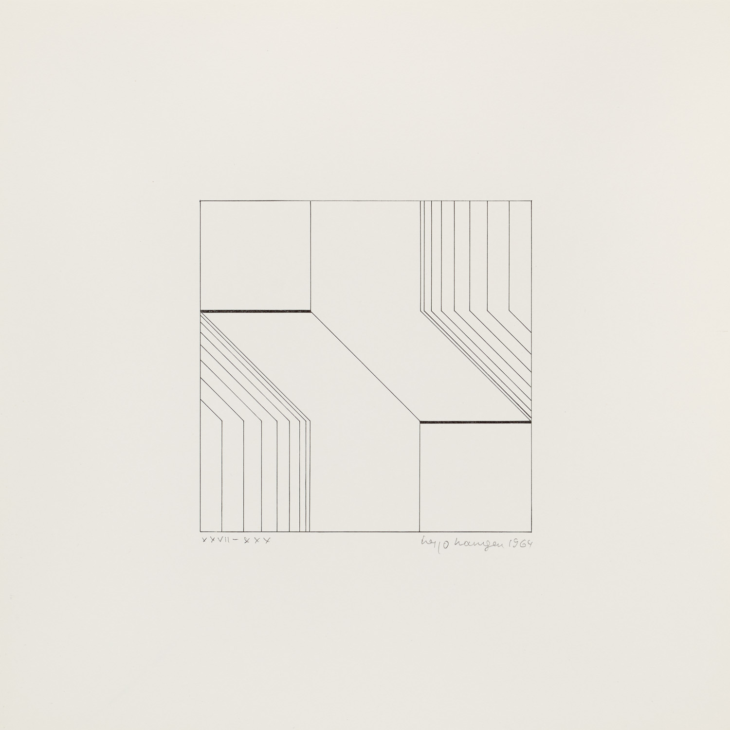 Konkrete Kunst – Je eines von 30 Exemplaren. - Hg. Galerie Schütze Bad Godesberg. - Druck bei J. Radermacher, Bad Godesberg. - "Hier sind Variationen über ein einfaches Thema. Abklärungen und Spiele. Ruhige Spiele, die aber reinste Sphäre des Geistes binden. Lob sei der Geometrie, die am Rande der lärmenden Welt, fern von jeder Aggressivität, eine überraschende Heiterkeit formuliert." (Michel Seuphor im einführenden Textblatt, Dez. 1964).