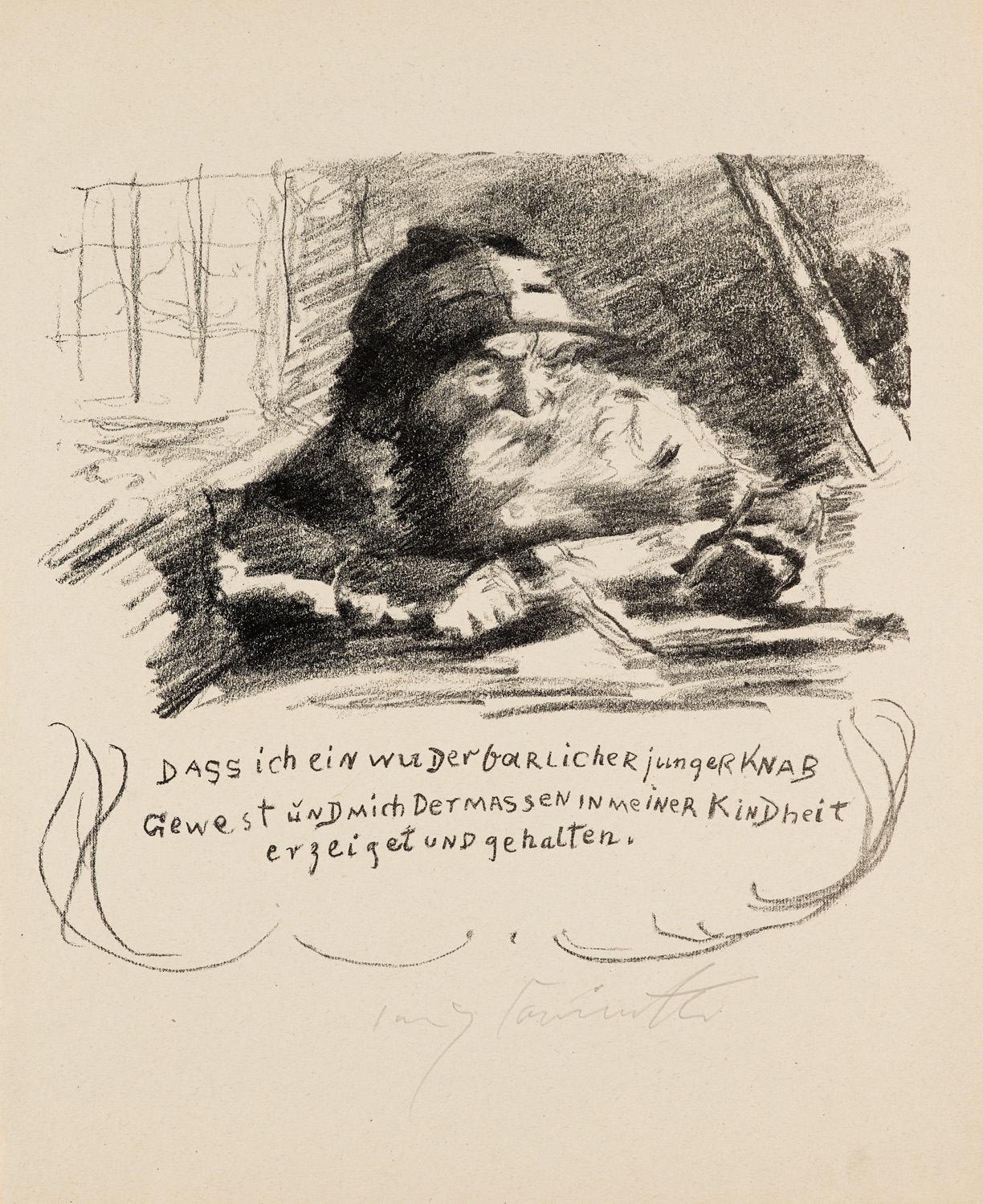 Online - Moderne und zeitgenössische Kunst – Schwarz 380 III. - Erschienen "Bei den Corinthern. 14 Radierungen von Lovis Corinth." In Mappe. Beigegeben: Signierte Lithographie aus: "Das Leben des Götz von Berlichingen - von ihm selbst erzählt.", 1920, gedruckt auf Zander Bütten. - Hrsg. v. Verlag Fritz Gurlitt, Berlin.