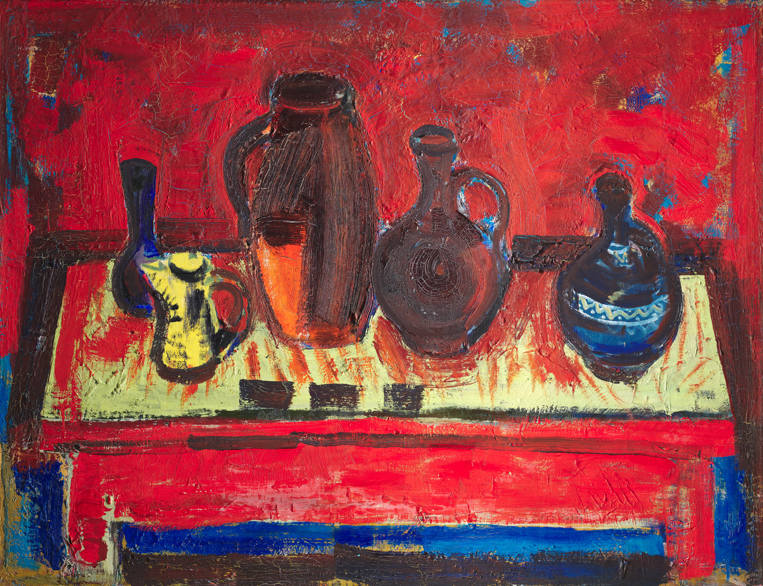 Stillleben mit Krügen. Um 1950. Öl auf Leinwand. 78,5 x 102 cm. Leinwand verso mit Nachlassstempel. Gerahmt. - Technik- und alterungsbedingt mit Krakelee. Insgesamt noch gut. In kräftigem Pinselstrich ausgeführte, farbexpressive Komposition.