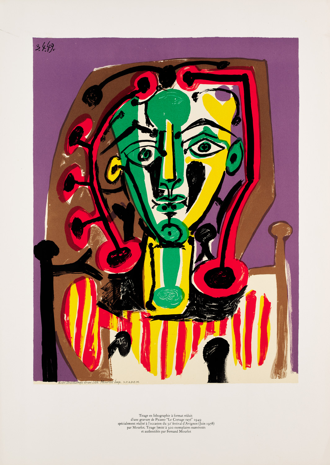 Online - Modern and Contemporary Art – Colour lithograph on Arches wove paper (with watermark). Datet in the stone, there also with typographic lithographer and printers details. With additional typographic details in the lower margin. Spot-mounted under mat the top edge of the sheet. - The edges of the sheet slightly browned, with occasional slight soiling in the white margin and a faint crease at the bottom right. Overall in good condition. Excellent, colour-rich impression of the depiction with margins, with deckle edge on the right. - Copy aside the edition of 300 numbered copies. - Printed by Mourlot, after an etching by Picasso from 1949.