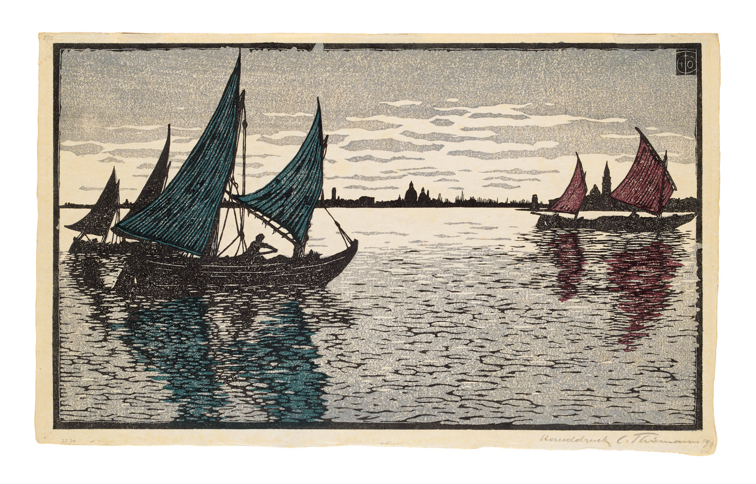 Abend von Venedig. 1910. Farbholzschnitt auf Japan. 29,5 x 50 cm (32 x 52 cm). Signiert und bezeichnet "Monodruck". Punktuell auf Unterlage und hinter Passepartout montiert. - Teils leicht gegilbt und mit kleineren Fleckchen, verso mit Farbdurchschlag. Insgesamt gut mit ausgezeichnetem, nuanciertem Druck.