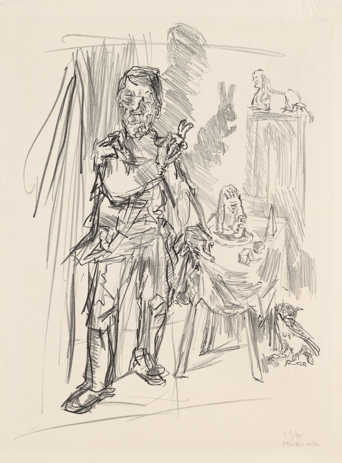Die magische Form (Der Zauberer). 1951. Lithographie auf Hahnemühle Bütten (mit Wz.). 51 x 37 cm (57,2 x 43 cm). Signiert und nummeriert. Verso im oberen Rand in Punkten auf Unterlage und unter Passepartout montiert. - Im Passepartoutausschnitt schwach lichtrandig, im Bereich der Montierung mit leichter Wellung. Insgesamt sehr gut. Prachtvoller, kreidiger Druck mit schmalem Rand.