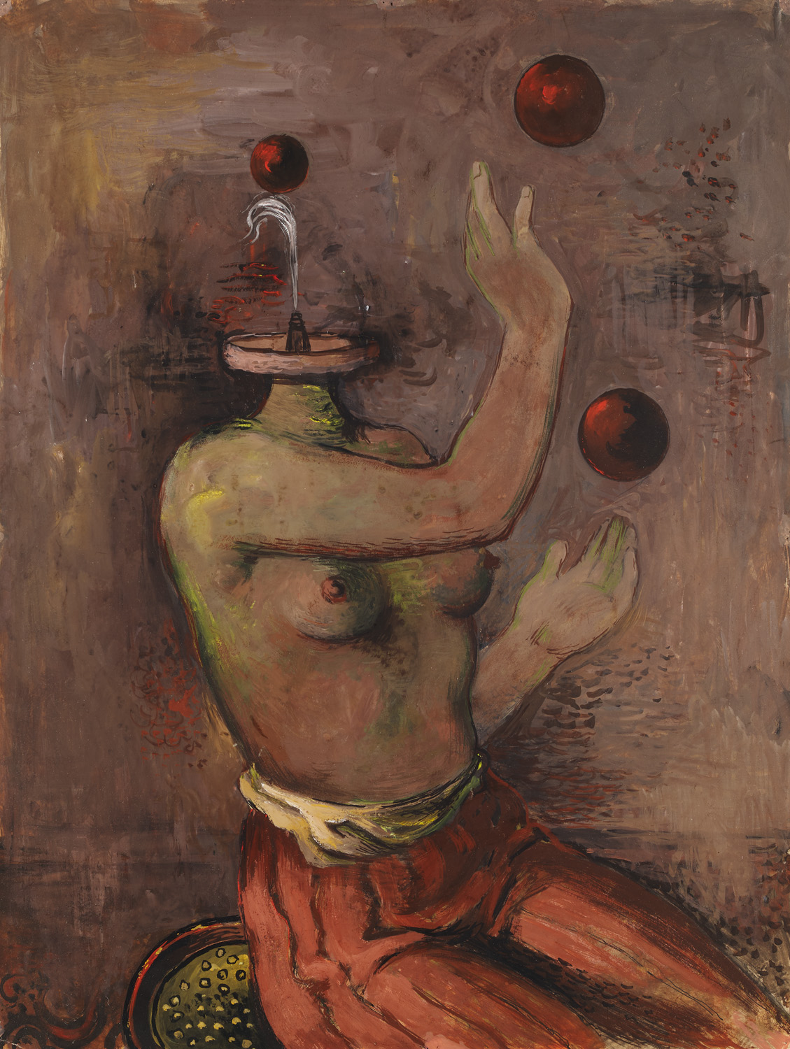 o.T. (Rote Kugeln). Um 1930. Gouache auf festem Velin. 54,4 x 41,2 cm. Verso mit Bezeichnung in Bleistift. Im oberen Rand in den Ecken auf Unterlage montiert, unter Glas gerahmt. - An den Ecken jeweils mehrere kleine, kaum merkliche Reißzwecklöchlein sowie diese leicht bestoßen, verso mit leichter Oberflächenanschmutzung, in den Ecken mit Spuren vorheriger Montierung. Insgesamt sehr gut. Bewegte Komposition mit pastos-kreidiger, frischer Farbwirkung.