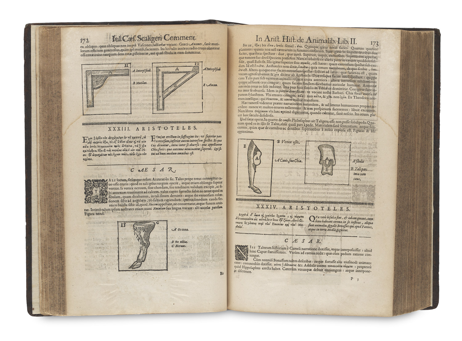 Historia de Animalibus. Iulio Caesare Scaligero interpreter, cum eiusdem Commentarijs. Mit Titel in Rot und Schwarz, gestochener Titelvignette und einigen Textholzschnitten. Toulouse, Raymond Colomiez, 1619. 16 Bll., 1248 S., 12 Bll. Folio. Restaurierter Ldr. d. Zt. mit mod. RSchild (berieben, bestoßen und etwas fleckig).