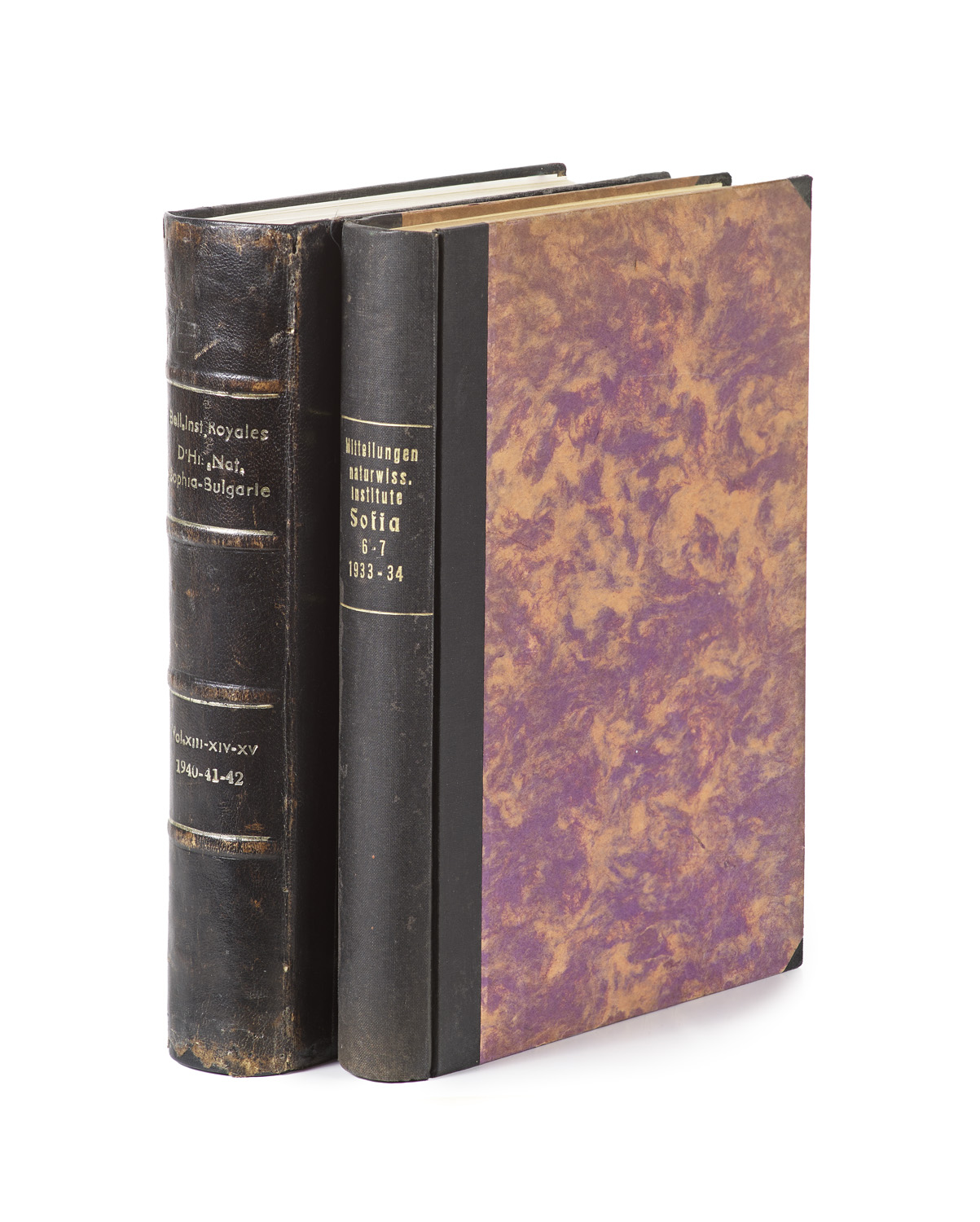 Mitteilungen aus den Königl. Naturwissenschaftlichen Instituten in Sofia. Hg. v. Iwan Buresch. 5 in 2 Bänden (6-7 u. 13-15). Mit 15 Tafeln (wovon 1 farbig), 2 gefalteten Karten, zahleichen Texabbildungen, sowie einigen Falttabellen. Sofia, Selbstvlg. (Hofdruckerei), 1933-42. 2 Bll. (Tit., Inhaltsverz.), 240 S. 2 Bll. (Tit., Inhaltsverz.), 224 S. 2 Bll. (Tit., Inhaltsverz.), 240 S. 2 Bll. (Tit., Inhaltsverz.), 320 (2, Corrigenda) S. u. 2 Bll. (Tit., Inhaltsverz.), 304 S. Hln. u. HLdr. d. Zt. mit gold- bzw. silbergepr. RTit. (stellenw. etw. beschabt u. berieb.)