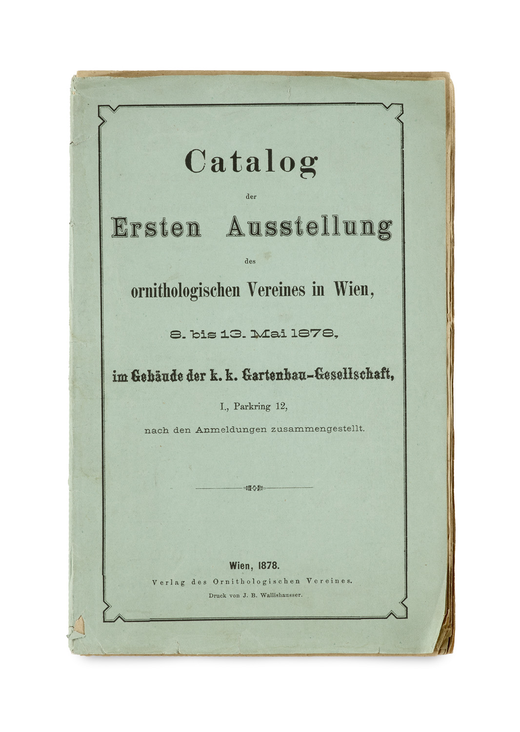 Catalog der Ersten Ausstellung des ornithologischen Vereines in Wien. 8. bis 13. Mai 1876, im Gebäude der K.K. Gartenbau-Gesellschaft ... Wien, J.B. Wallishausser für den Verlag des Ornithologischen Vereines, 1878. 64 S. 8°. OBrosch. (einige tls. hinterlegte Randläsuren, bestoßen, tls. knitterig).