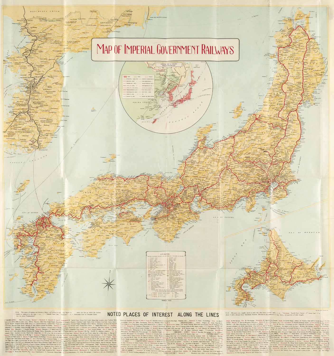 Map of Imperial Government Railways. Chromolithogr. Karte des japanischen Eisenbahnnetzes. Traffic Department Imperial Government Railways Tokyo, Japan. March, 1913. Format ca. 79 x 74,5 cm. Mehrfach gefalt. u. an einem Segment montiert in Kt. d. Zt. mit gepr. DTitel u. Metall-Druckknopf (Kt. papierbedingt gebräunt u. mit kl. Beschädigung).