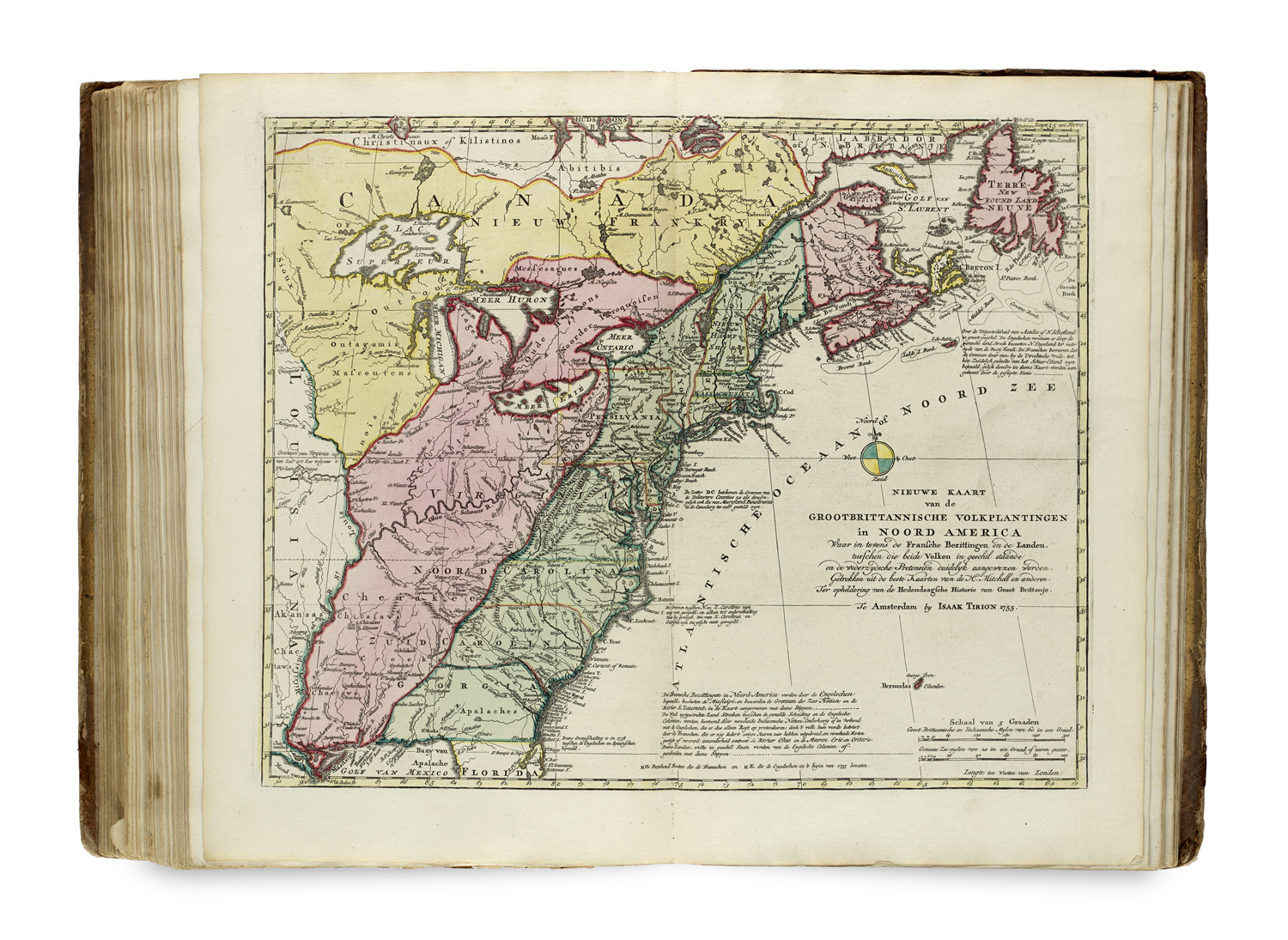 Nieuwe en beknopte Hand-Atlas. Bestaande in eene Verzameling van eenige der algemeenste en noodigste Landkaarten. Alle in de Nederduitsche Taal (...) Mit 112 doppelblattgroßen und durchgehend altkolorierten Karten im Kupferstich auf 109, wovon 3 gefalteten Blättern, mehrere Karten mit illustrierten Kartuschen. Amsterdam, Isaac Tirion, o. J. (1769-84). 2 Bl. (leer), 2 Bl. (Tit., Reg.), 109 Kartenbl., 2 Bl. (leer). Folio (42,5 x 27,5 cm, Bl.) HLdr. d. Zt. auf sechs erhabenen Bünden mit ornament. Rückenvergoldung (Vorderdeckel lose, untere Kapitale mit Pgt. alt stabilsiert, an den Ecken und Kanten mit Fehlstellen, beschabt).
