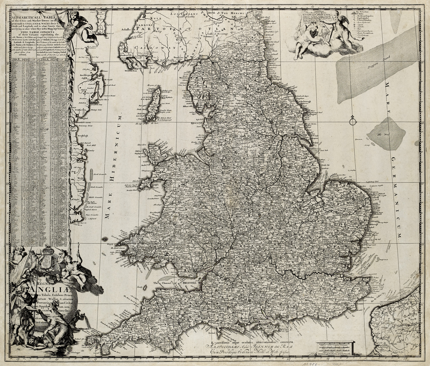 Geography and Travel – Copperplate map on laid paper. - Map of England and Wales with an "Alphabeticall Table of the Cities and Market Towns on the Great Roads in England & Wales" above the title cartouche on the left margin. With printing privilege "Cum Privilegio Ordinum Holl et West-frisiae." - Margins browned and stained. Restored in places and with smoothed center fold. Overall in good condition.